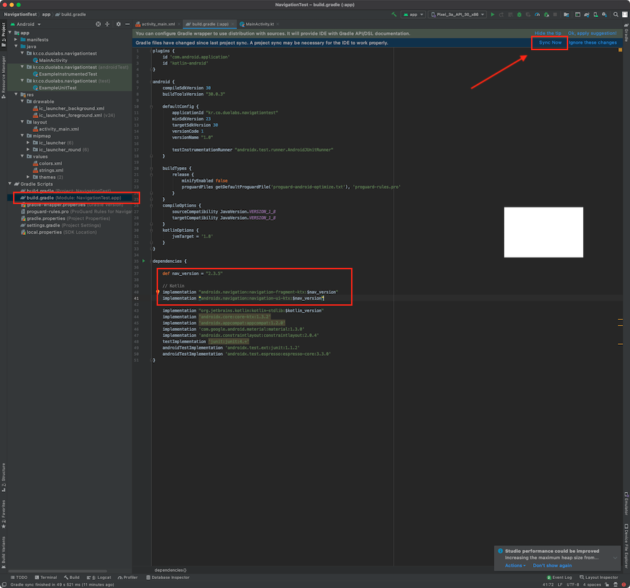 ▼ Jetpack을 사용하기 위해서 build.gradle 파일에 다음 종속 항목을 추가해줍니다. Gradle Scripts 파일의 build.gradle (Module: app)을 선택하고 다음과 같이 코드를 추가합니다. 코드를 추가하고 Sync Now를 눌러 동기화해줍니다.