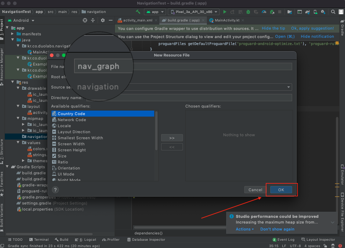 ▼ 파일이름을 nav_graph로 지정하고 OK 버튼을 눌러줍니다.