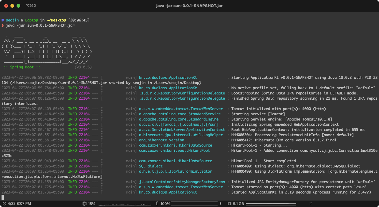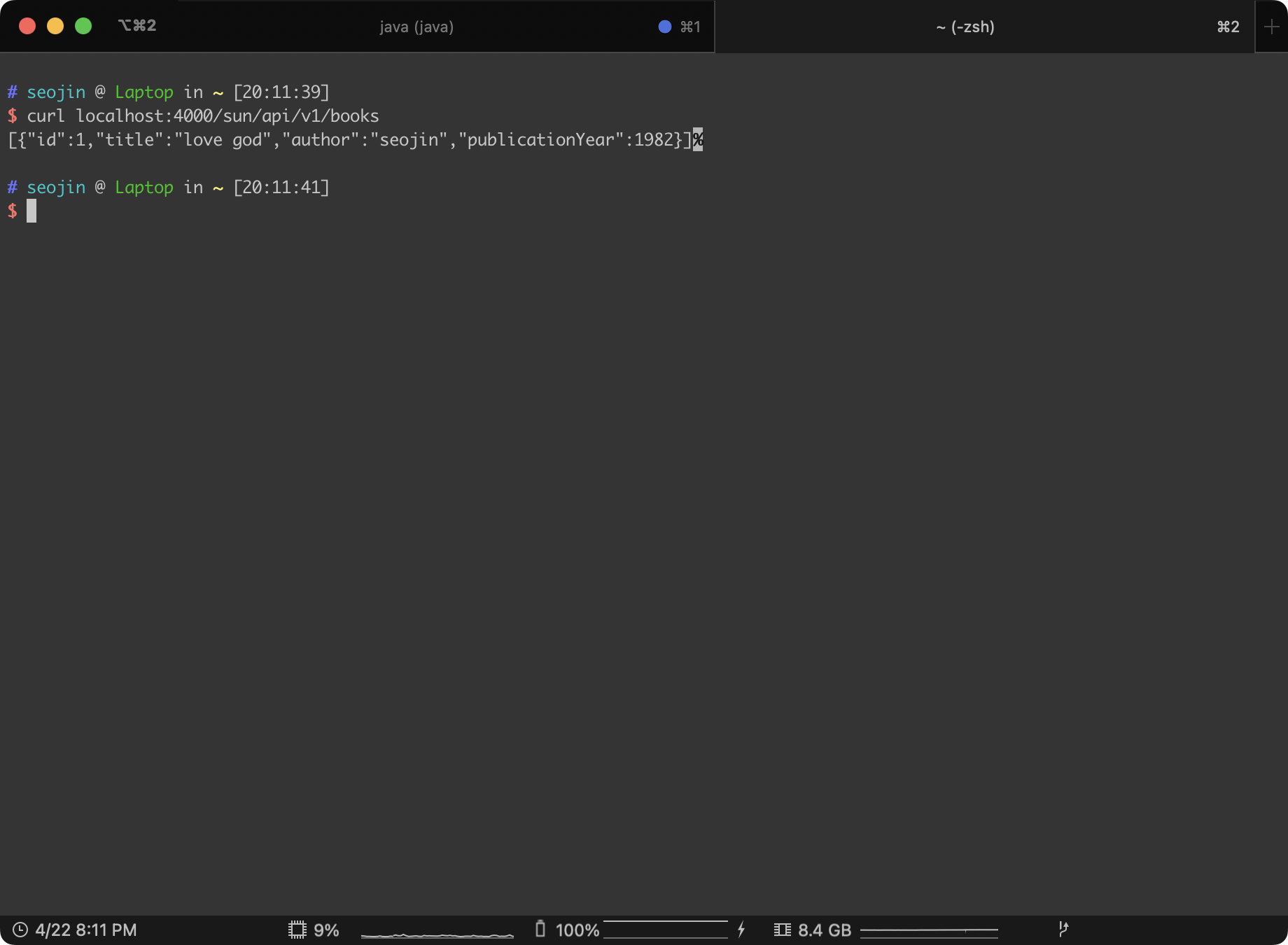 ▼ java 명령어에 -jar 옵션으로 어플리케이션 실행합니다. 새로 터미널을 열어서 curl로 API를 호출해 보면 정상동작 하는 것을 알 수 있습니다.