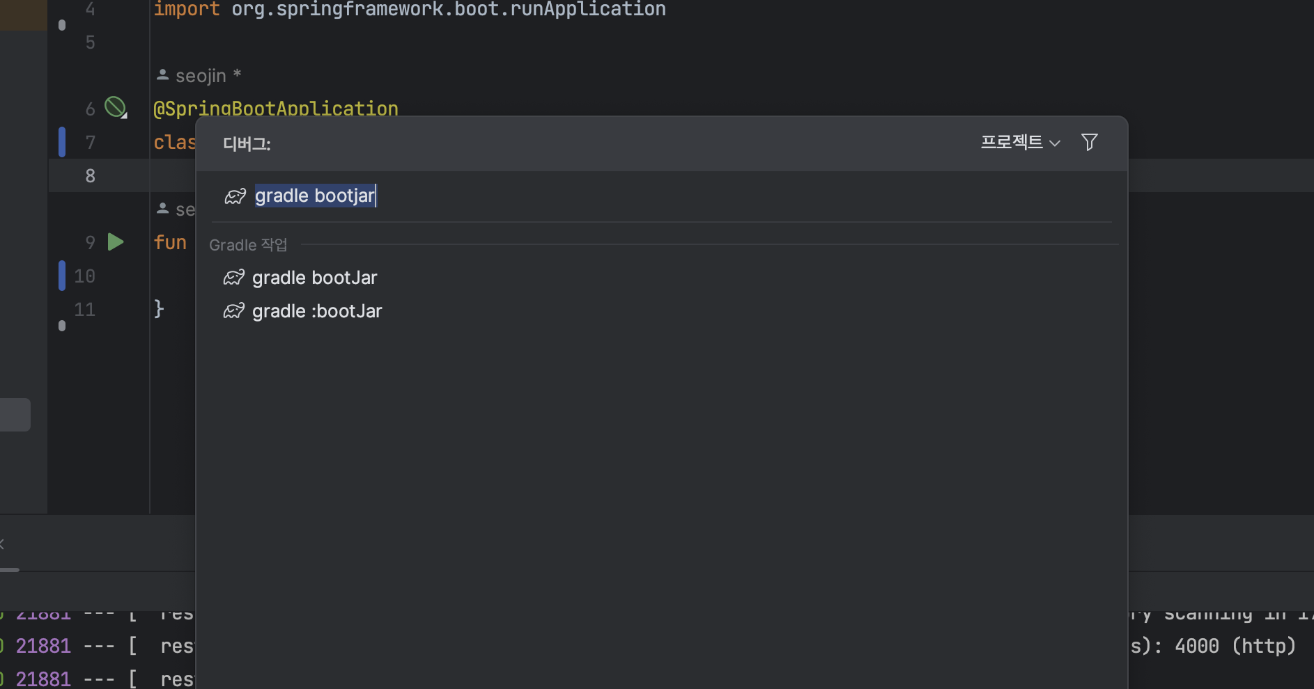 ▼ 우선 인텔리제이로 프로젝트를 열고 control 키를 두 번 연속 눌러줍니다. Run Anything 검색 창에서 gradle bootjar를 선택해줍니다. 만약 다시 생성하려면 gradle clean 명령이후에 다시 gradle bootjar 명령을 실행합니다.