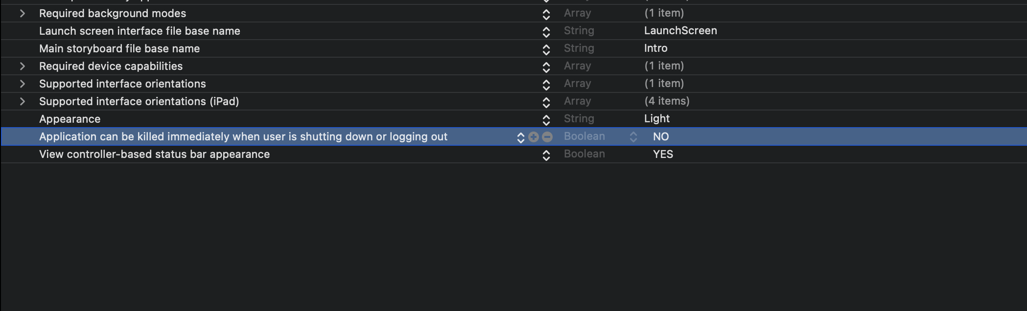 iOS 개발시 AppDelegate의 applicationWillTerminate 호출이 되지 않거나 macOS의 NSApplicationWillTerminateNotification이 호출되지 않을 때 다음과 같이 Info.plist에서 해당 값을 확인해 볼 필요가 있습니다. 해당 값을 NO 로 설정하고 앱을 재실행하면 terminator가 잘 호출 되는 것을 확인 할 수 있습니다.