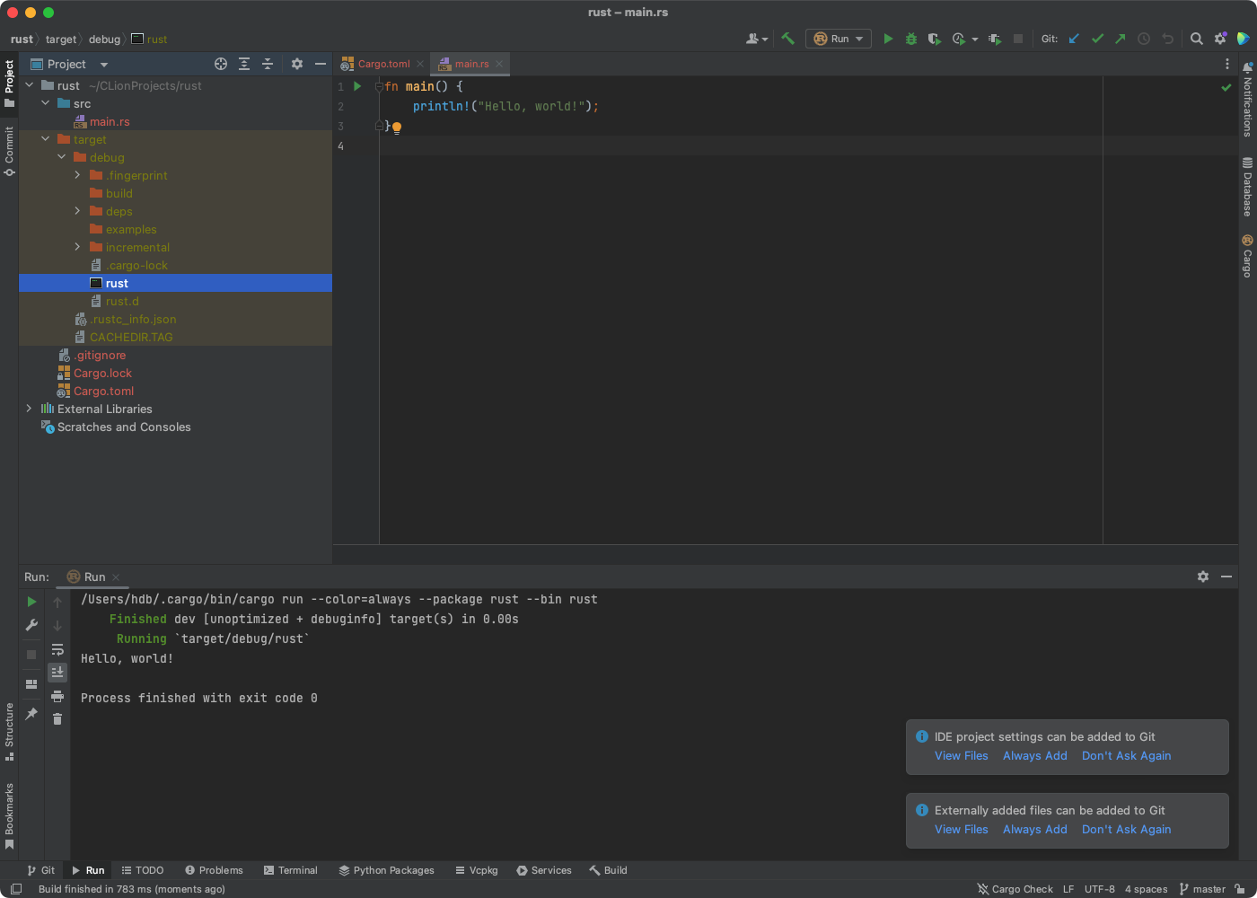 ▼ 이제 Control + R 버튼을 눌러서 실행하면 Hello, world! 메시지가 나오는 것을 볼 수 있습니다. rustc 로 컴파일 해도 되지만 cargo로 빌드하면 다음과 같이 target이라는 폴더가 만들어지고 debug 폴더에 프로젝트 명으로 실행파일이 생성된 것을 볼 수 있습니다. 만약 릴리즈 모드를 통해 최적화된 실행파일을 만들고 싶다면 cargo build 명령어 뒤에 --release 명령을 추가하면 됩니다.