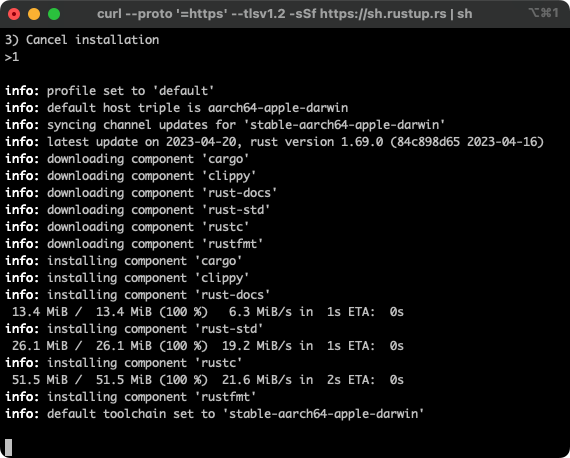▼ 설치가 완료되면 터미널을 종료하고 다시 시작합니다. 그리고 rustc --version, cargo --version을 실행해서 잘 동작하는지 확인합니다. 저와 다른 버전이 표시 될 수 있지만 버전이 잘 출력된다면 rust 환경이 잘 구성된 것입니다.