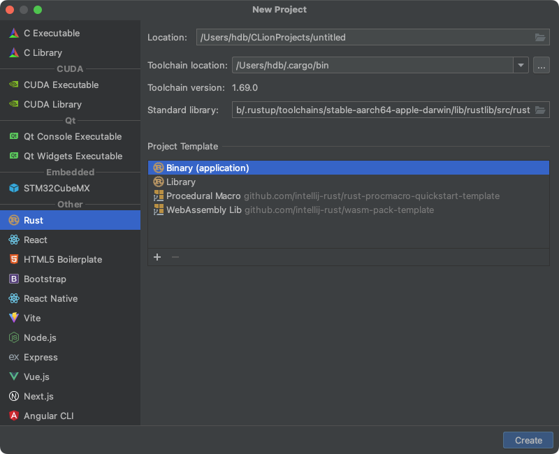 ▼ 우선 CLion IDE 를 실행하고 새로운 Rust 프로젝트를 생성합니다. 프로젝트 템플릿은 Binary(application)을 선택합니다.