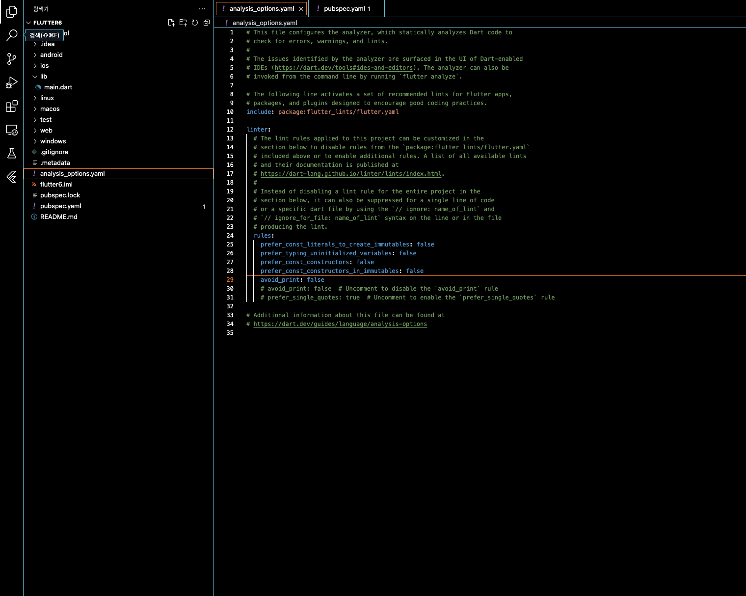 ▼ 마지막으로 플러터의 경우 기본적으로 린트(lint)를 사용하게 되는데 처음 개발할 떄 이 lint 제약사항은 너무 귀찮을 수 있습니다. 때문에 몇가지 옵션을 주어 린트를 무시해야 하는데 다음과 같이 analysis_options.yaml 파일에서 추가하면 됩니다.