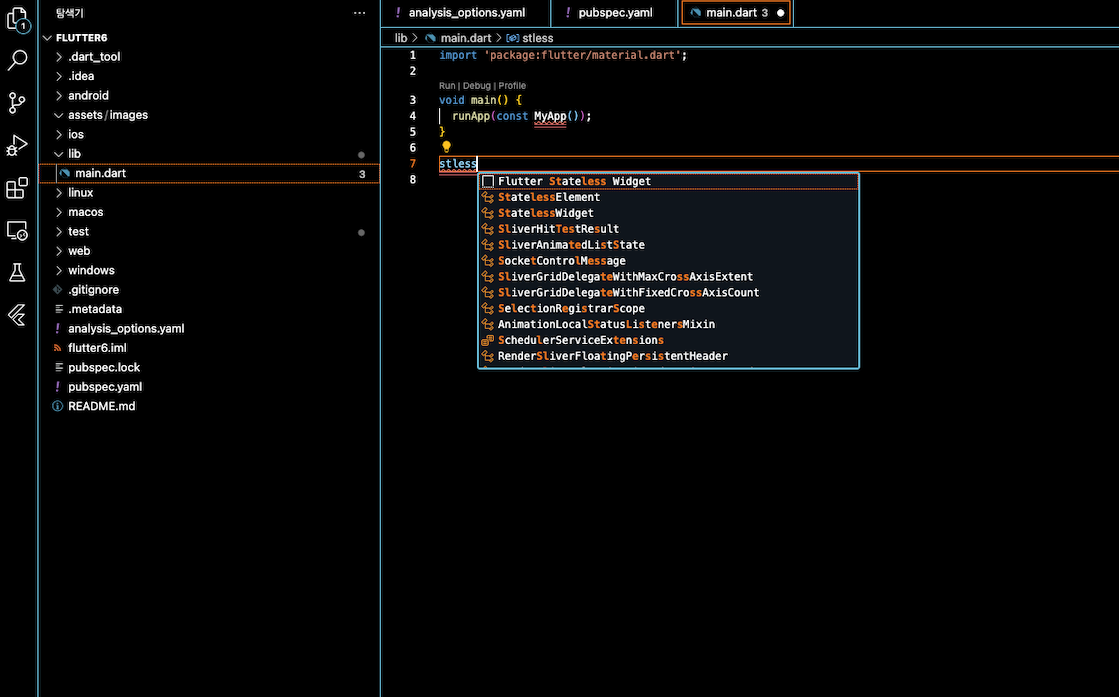 ▼ main.dart의 모든 코드를 제거하고 다음과 같이 main() 함수만 남깁니다. 그리고 stless를 추가하고 탭키를 누르면 Flutter Stateless Widget이 만들어지게 됩니다.