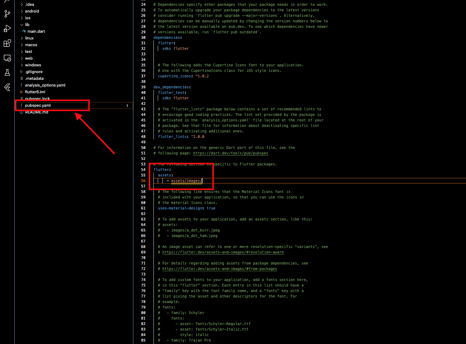 ▼ 이제 pubspec.yaml 파일을 수정하여 이미지 폴더를 만들어보겠습니다. 안드로이드나 아이폰 개발을 하다보면 자동적으로 Assets에 대한 폴더가 구성되어 있으나 플러터의 경우 이와 같이 경로를 직접 지정해줘야 합니다. 하지만 실제로 assets/images 라는 폴더가 없기 때문에 lint에 의해 경고를 표시하는 것을 볼 수 있습니다.