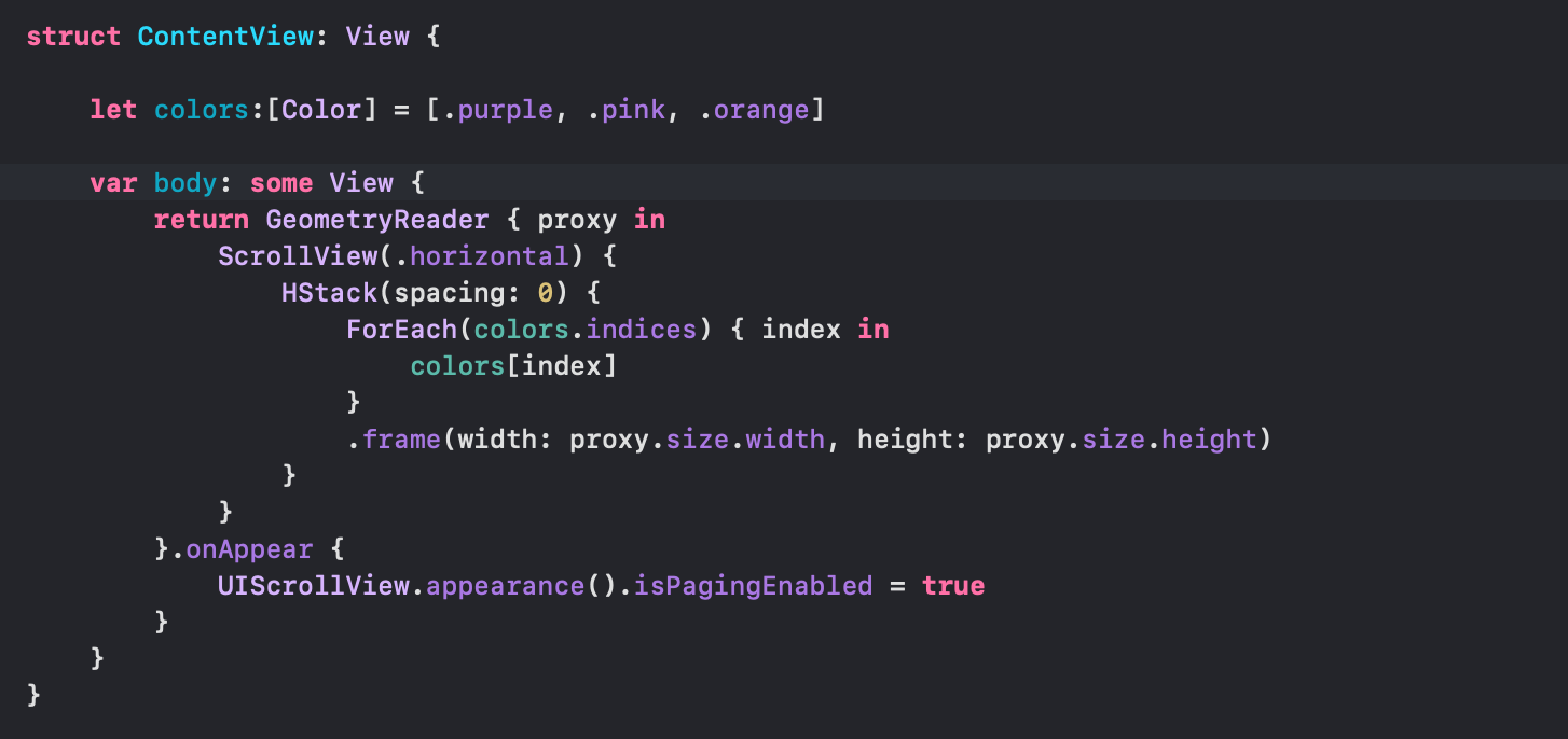 - 마지막으로 onAppear 구문에서 스크롤뷰의 속성인 isPagingEnabled 값을 true로 변경해줍니다.