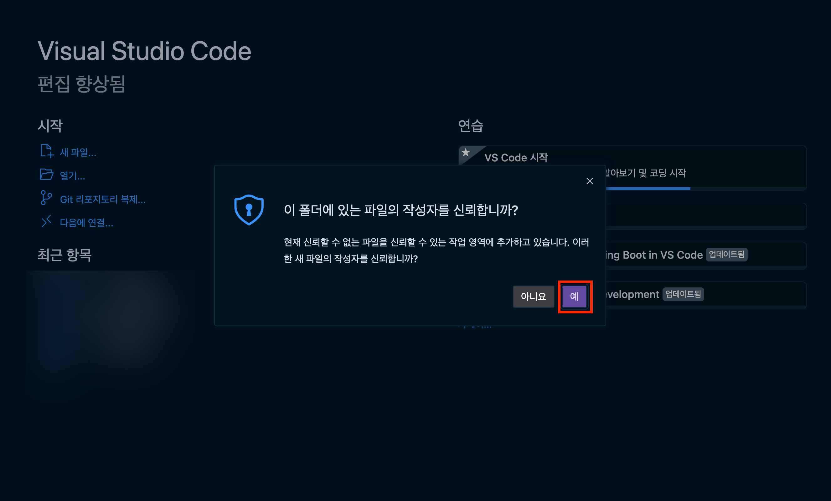 ▼ 이 폴더에 있는 파일의 작성자를 신뢰합니까? 라는 경고 문구가 나옵니다. 보안에 관련된 사항이고 워크스페이스를 만들기 위해서 예 버튼을 눌러줍니다.