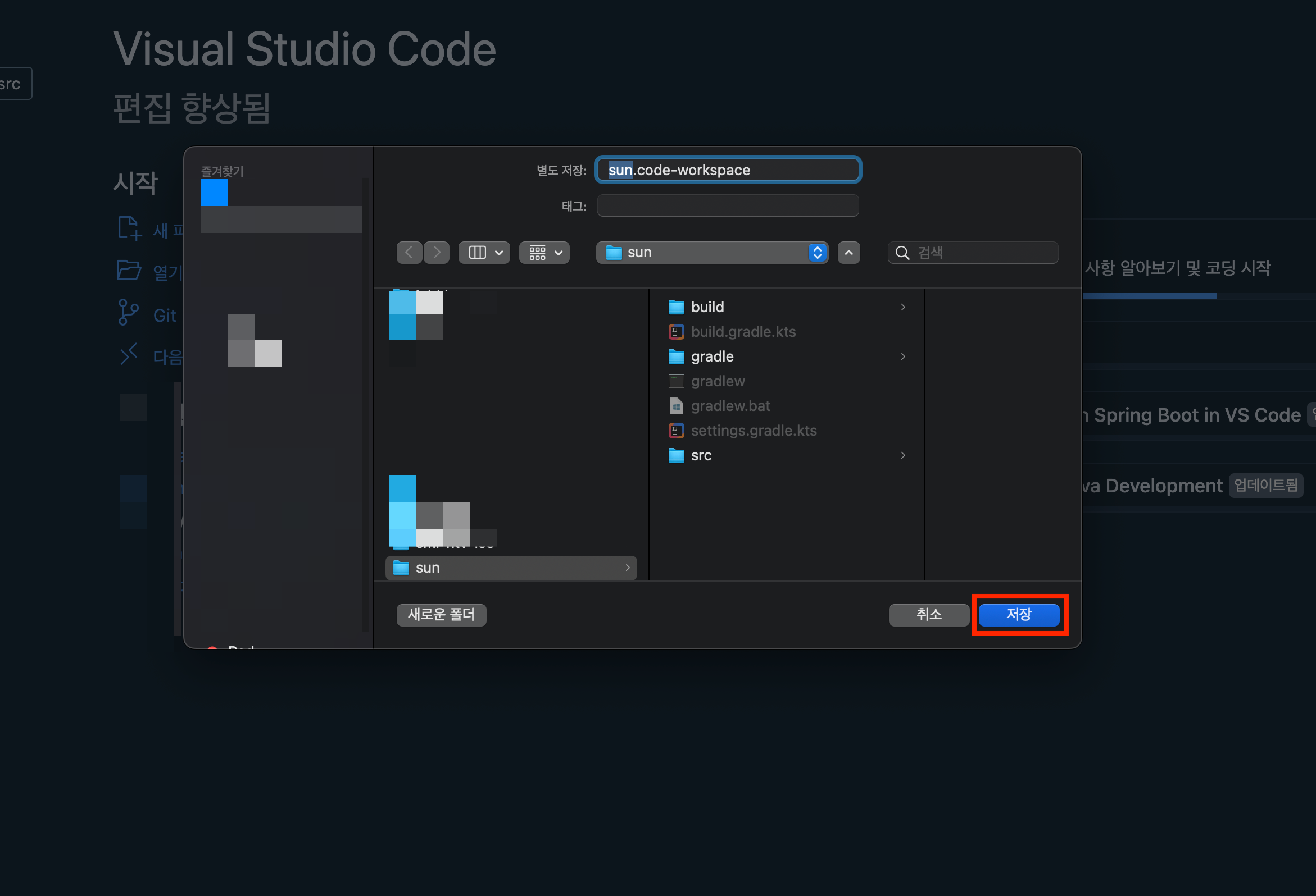 ▼ code-workspace 확장자의 VS Code 워크스페이스 파일을 만들기 위해서 이름을 지정합니다. 기본값은 폴더 이름이지만 직접 수정이 가능합니다. 저장 버튼을 눌러 종료합니다.
