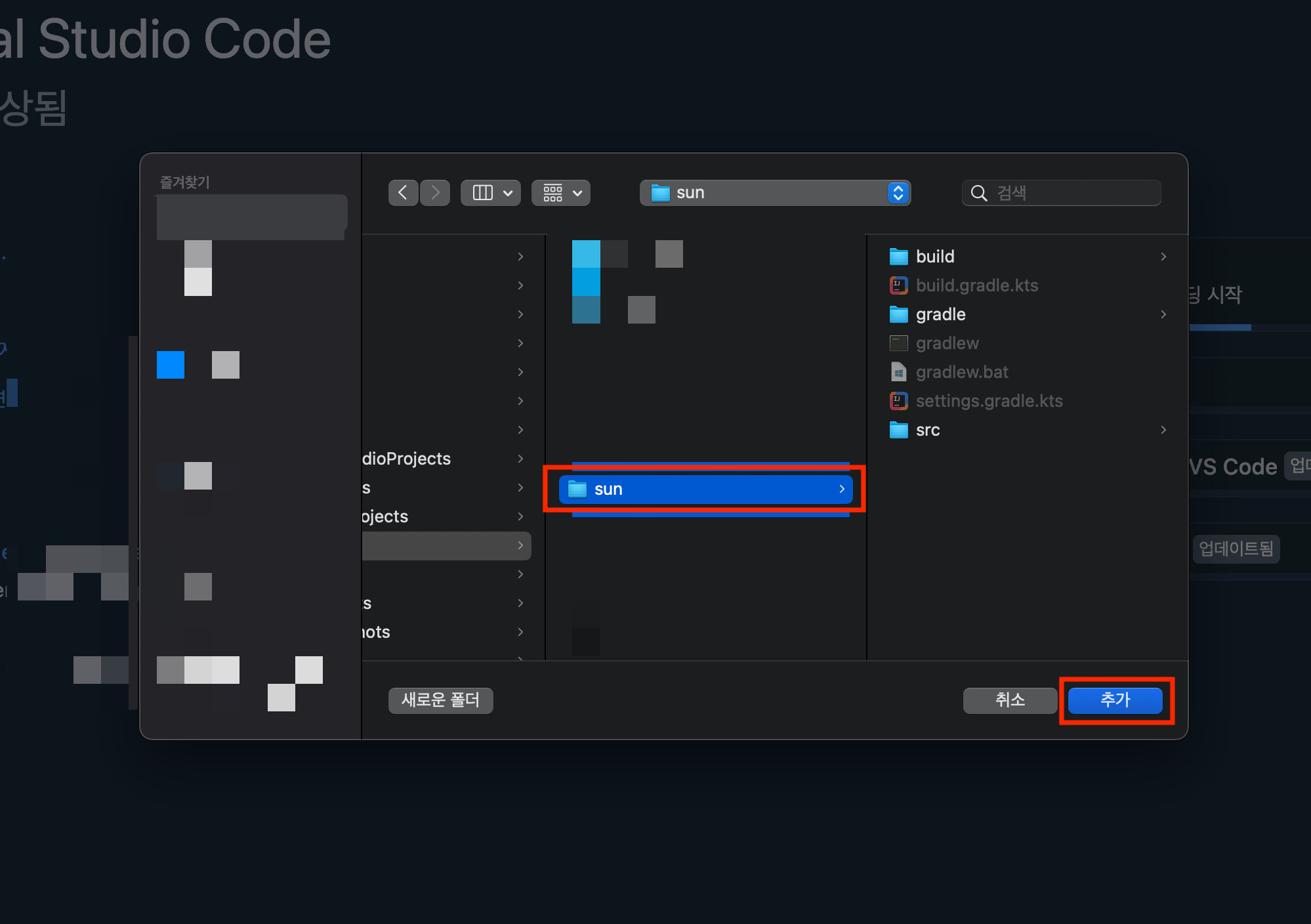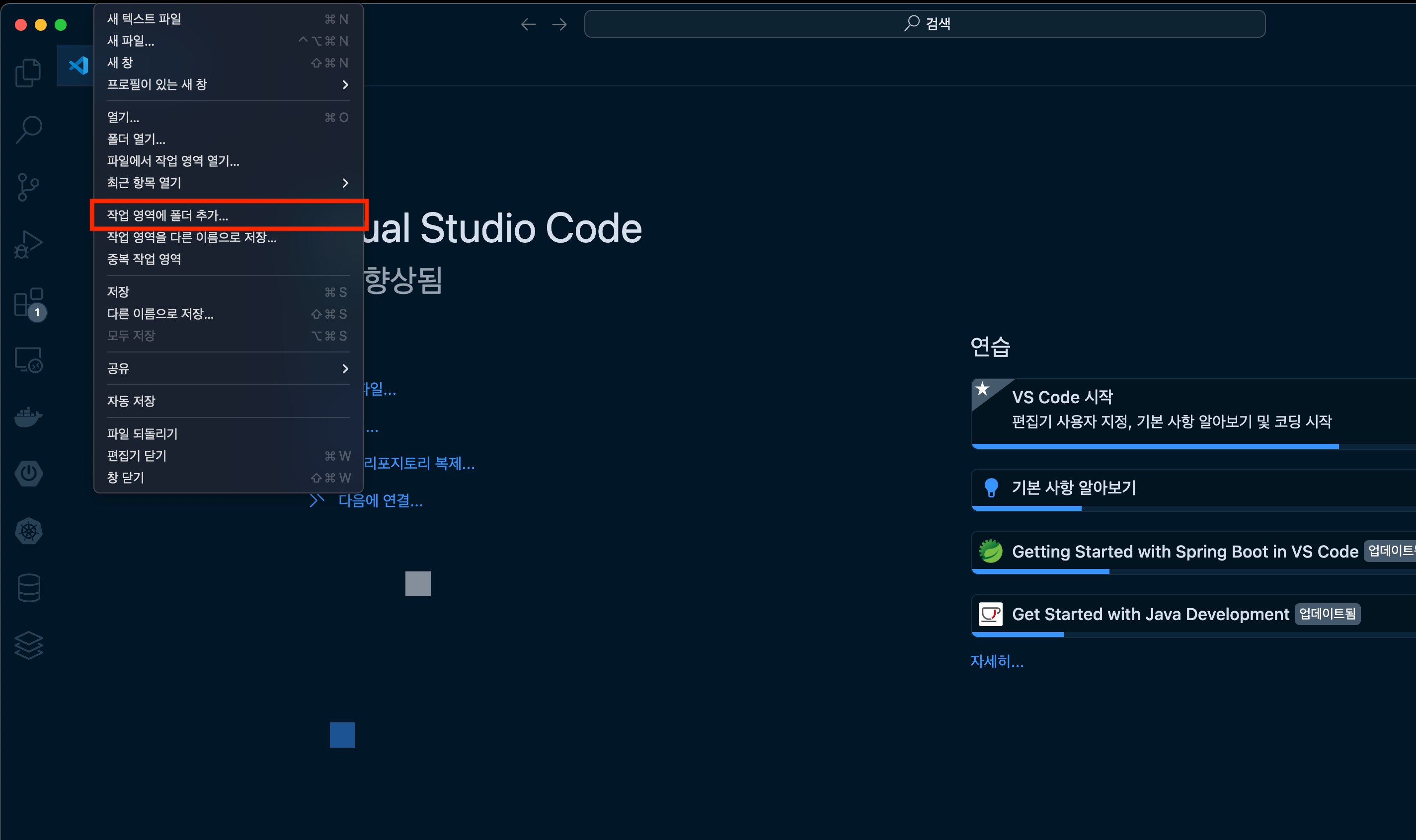 ▼ 먼저, 작업하고자 하는 프로젝트의 폴더를 준비합니다. 여러 프로젝트를 함께 관리하고 싶다면 관련된 모든 폴더를 하나의 워크스페이스에 추가할 수 있습니다. 직접 원하는 폴더를 열어 해당 작업트리를 열어도 상관 없지만 다음과 같이 "작업 영역에 폴더 추가" 메뉴를 통해서 프로젝트를 열 수도 있습니다.