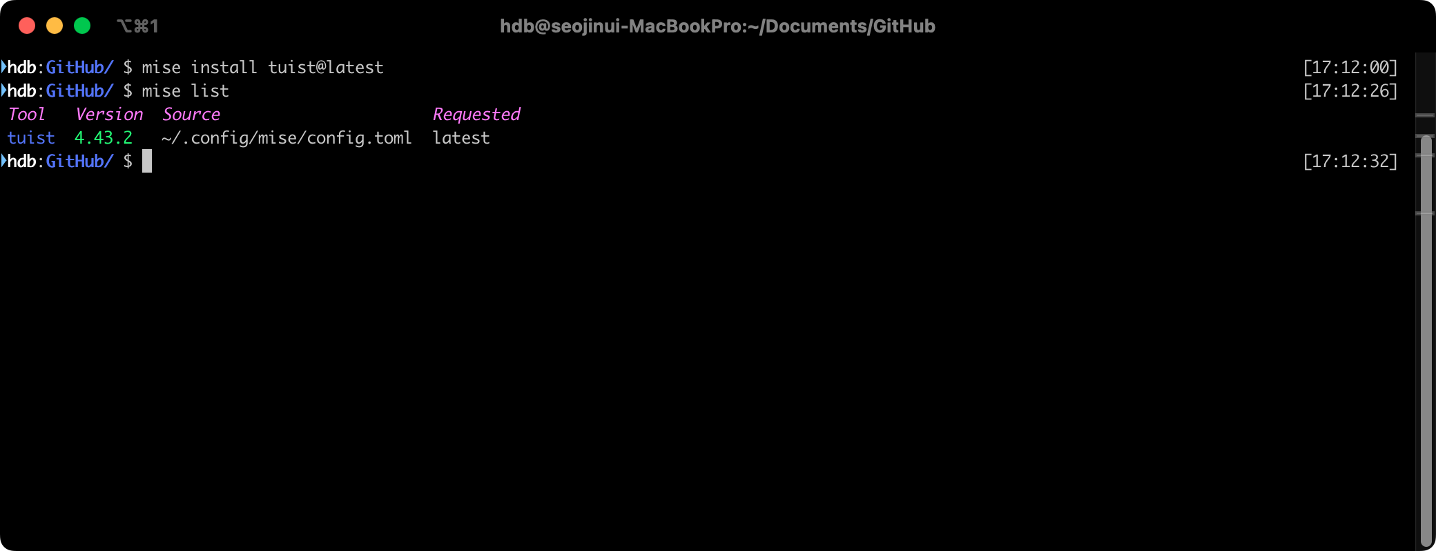 ▼ 3. mise 를 통해 tuist 를 설치합니다.