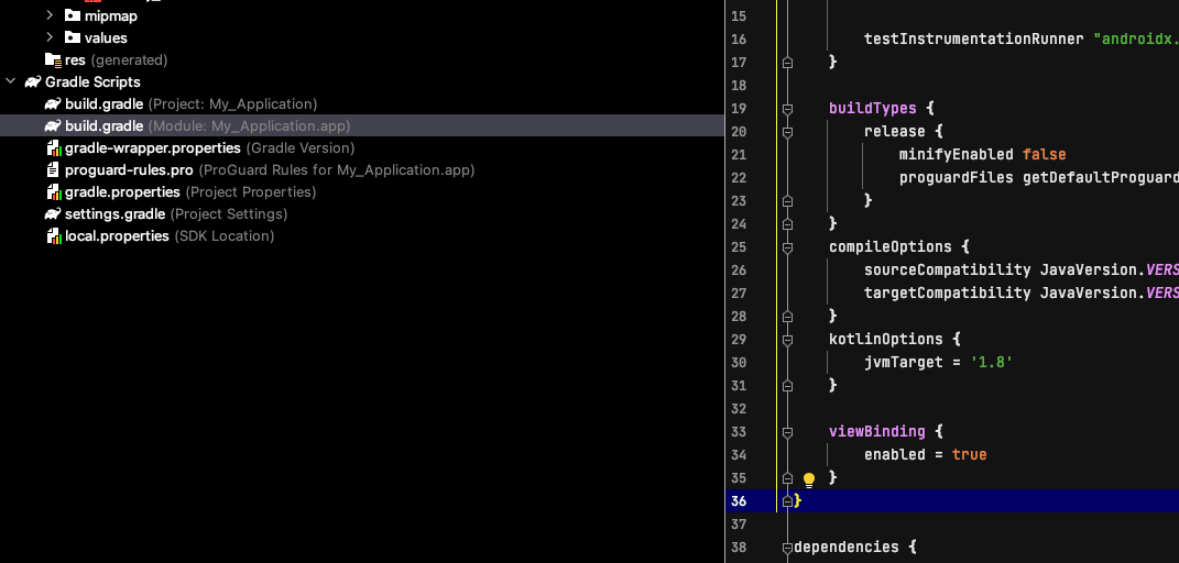 ▼ 뷰 바인딩을 사용하기 위해서는 우선 모듈 build.gradle 파일을 다음과 같이 수정해야 합니다. anroid 블록에 다음 코드를 추가합니다. (안드로이드 스튜디오 4.0 이상) 변경이 다 되었으면 편집기 창의 오른쪽 위에 있는 Sync Now를 눌러 그래들 빌드의 변경 사항을 프로젝트에 적용합니다.
