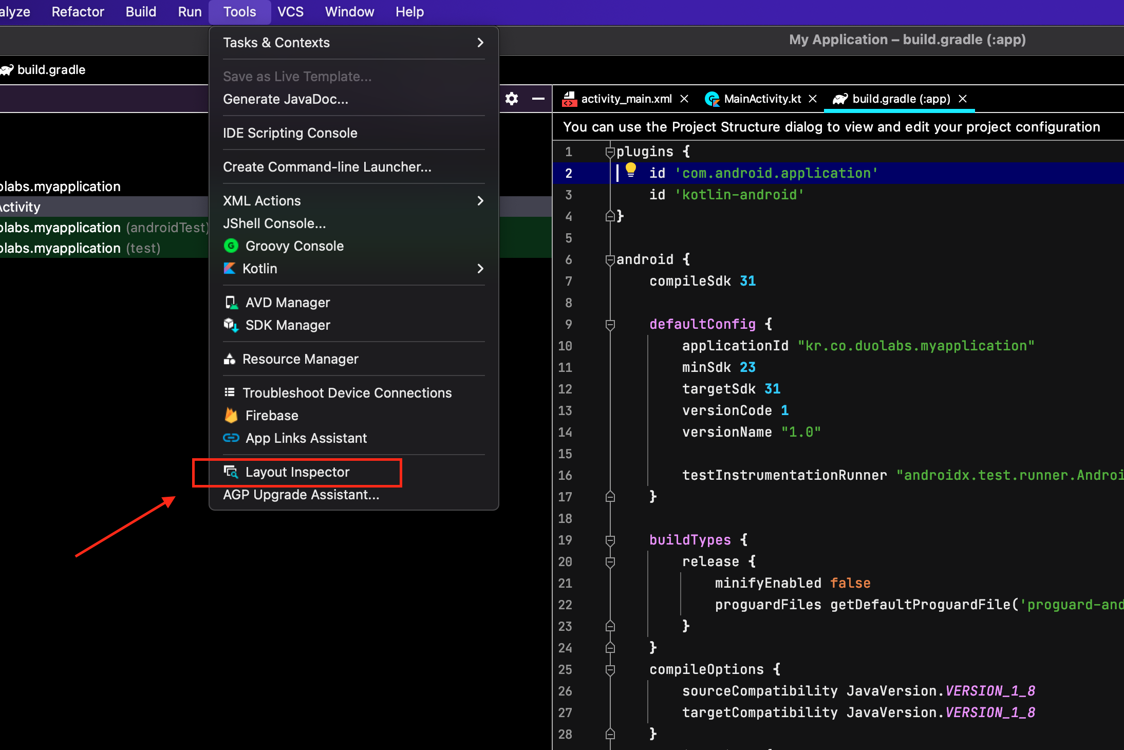 안드로이드의 액티비티는 스택(Stack) 형태로 관리됩니다. 후입 선출 구조(LIFO)이며 가장 나중에 추가된 액티비티가 스택 가장 상단에 존재하며 안드로이드의 백버튼을 누르면 가장 나중에 추가된 TOP 위치의 액티비티가 제거(POP) 됩니다. 안드로이드 스튜디오에서 Layout Inspector를 실행하면 액티비티의 스택을 가시적으로 볼 수 있습니다. (Tool > Layout Inspector)