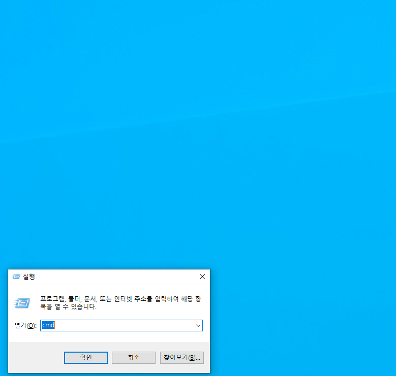 ▼ 마지막으로 자바 JDK가 잘 동작하는지 테스트 해보겠습니다. 실행 창(Window + R)을 열고 열고 cmd 라고 입력해서 명령 프롬프트 창을 열어줍니다.