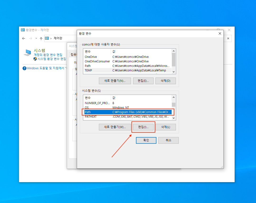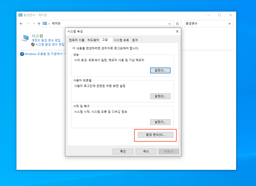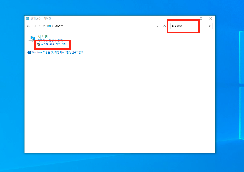 ▼ 제어판을 열어서 검색창에 환경변수라고 입력하면 시스템 환경 변수 편집 메뉴가 보입니다. 시스템 환경 변수 편집을 선택합니다.