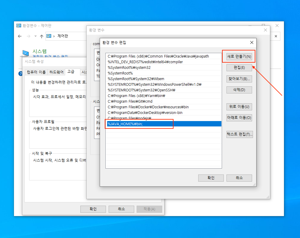 ▼ 환경 변수 편집창이 열리면 새로 만들기 버튼을 눌러서 다음과 같이 입력해줍니다. 이렇게 해주는 이유는 Path를 불러올 때 JAVA_HOME이라는 우리가 만든 Path를 추가해줘야 하기 때문입니다. bin 경로를 추가해주는 이유는 Java 실행파일이 bin 폴더에 있기 때문이구요.