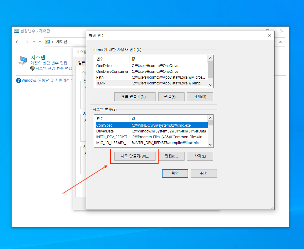 ▼ 환경 변수창에서 하단에 시스템 변수 탭에서 새로 만들기 버튼을 선택합니다.