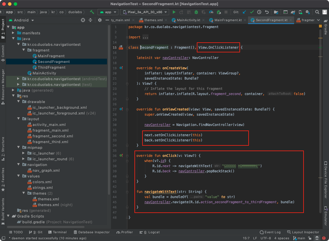 ▼ 이번에는 두 번째 Fragment인 SecondFragment를 수정해보겠습니다. MainFragment에서 처럼 NavController를 선언하고 onViewCreated에서 할당해 주었습니다. 이번에는 next, back 버튼에 각각 이벤트를 주어야 하는데 View.OnClickListener 인터페이스를 구현하겠습니다. 해당 구현을 하려면 다음과 같이 onClick 메서드를 작성해야 합니다.