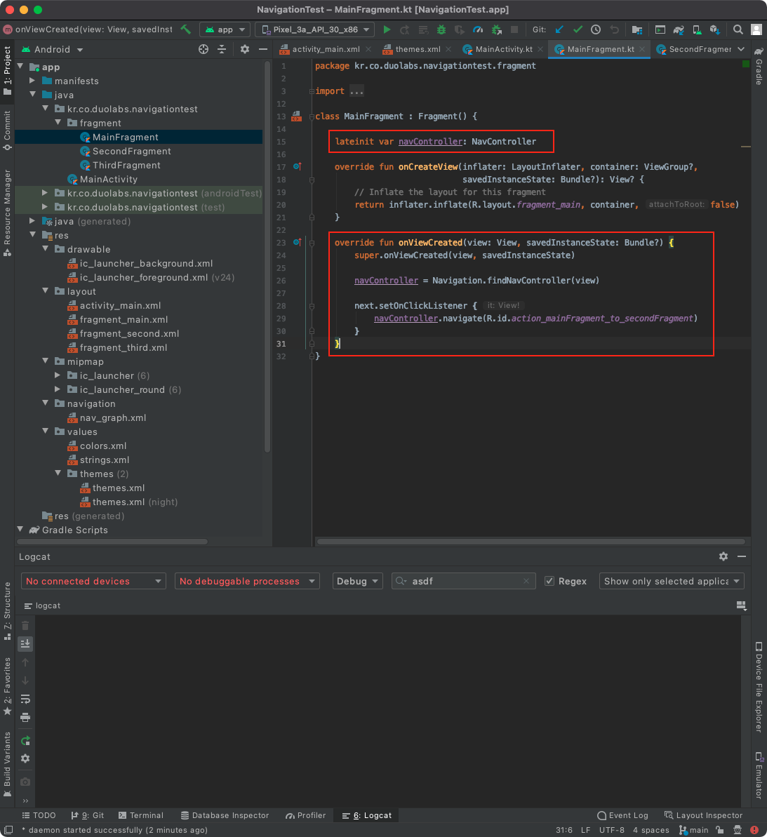 ▼ onViewCreate 함수에서 navController를 할당하고 next 버튼에 setOnClickListener 이벤트를 연결해줍니다.
