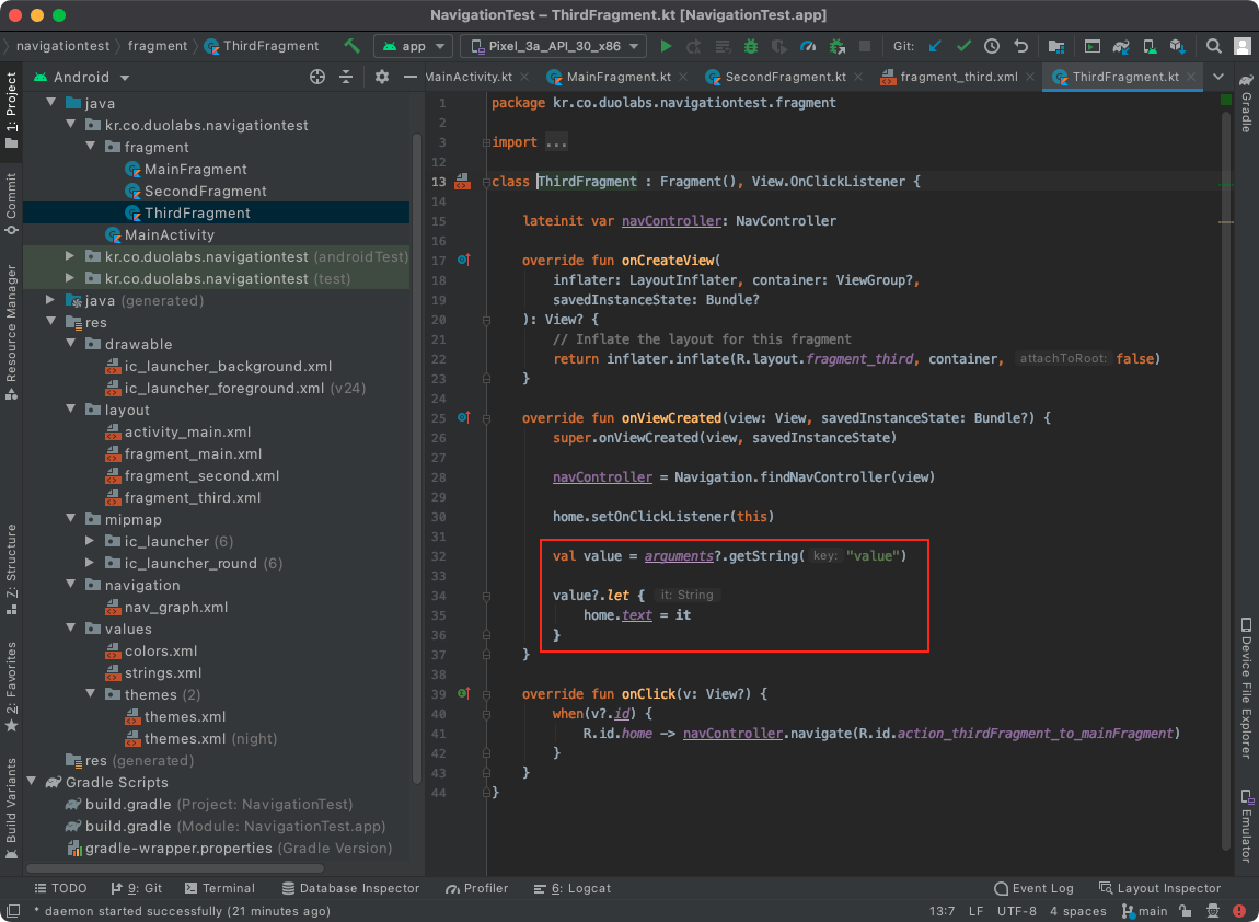 ▼ 마지막으로 ThirdFragment를 수정할 차례입니다. navController를 선언하고 View.OnClickListener를 구현하는 것은 모두 동일합니다만, 2번째 페이지인 SecondFragment.kt에서 전달된 값을 받는 부분이 포함되어 있습니다. arguments 객체에 포함돼서 들어오며 getString함수로 가져옵니다. Key는 이전 클래스에서 선언한 value라는 값으로 가져왔습니다.