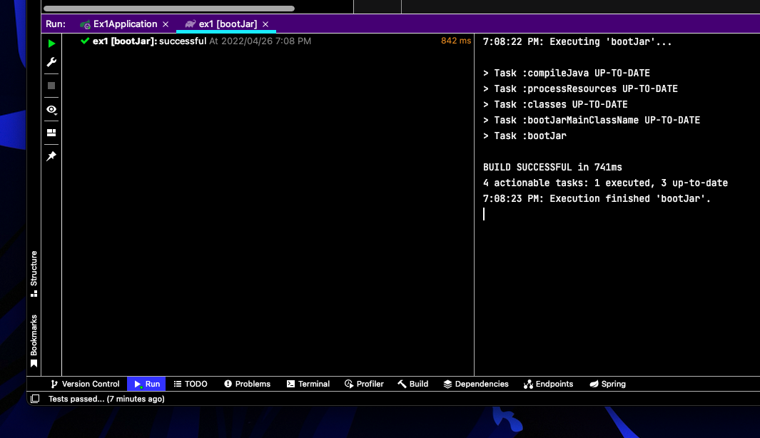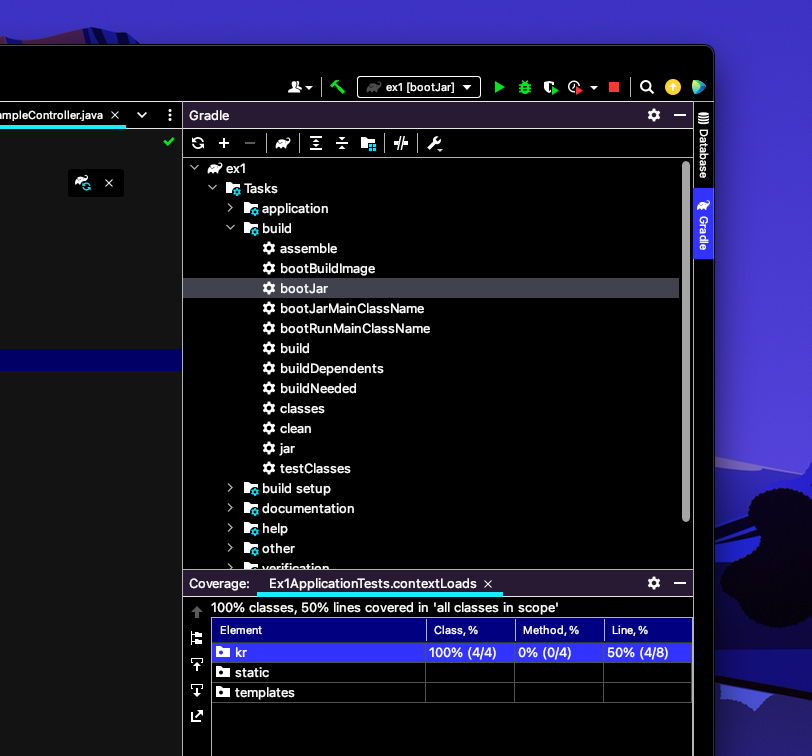 ▼ 우측 상단에 그래들(Gradle) 탭을 열어줍니다. 그리고 bootJar라는 그래들 명령을 더블클릭해서 실행해줍니다.