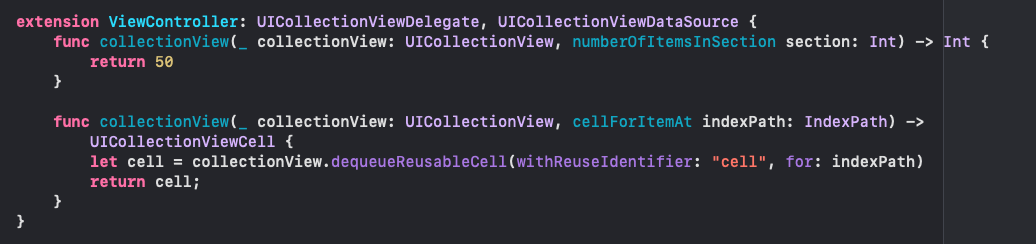 ▼ 뷰 컨트롤러에 extension을 설정하고 다음과 같이 UICollectionViewDelegate, UICollectionViewDataSource 인터페이스를 구현합니다. 다음 두개의 함수를 구현해야 합니다.