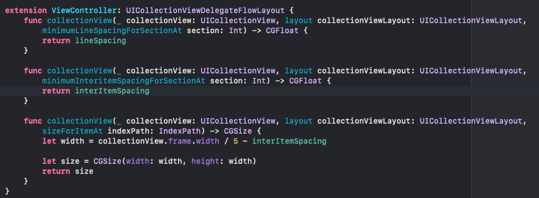 ▼ 이제 뷰 컨트롤러의 새로운 extension을 만들어 UICollectionViewDelegateFlowLayout을 구현해줍니다. 총 3개의 메서드를 구현합니다.