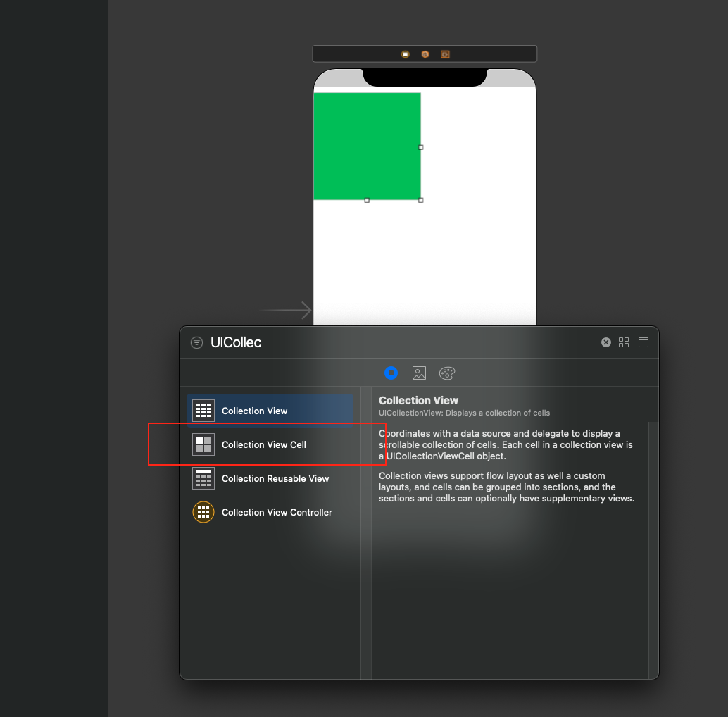 ▼ 이번에는 CollectionViewCell을 선택하여 드래그해서 CollecionView 화면 위로 올립니다.