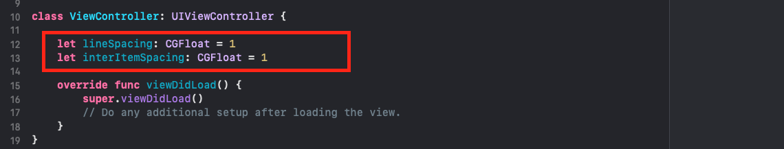 ▼ 우선 뷰 컨트롤러에 두개의 변수를 선언해줍니다. 각각 가로, 세로의 여백 간격이라고 생각하면 됩니다.