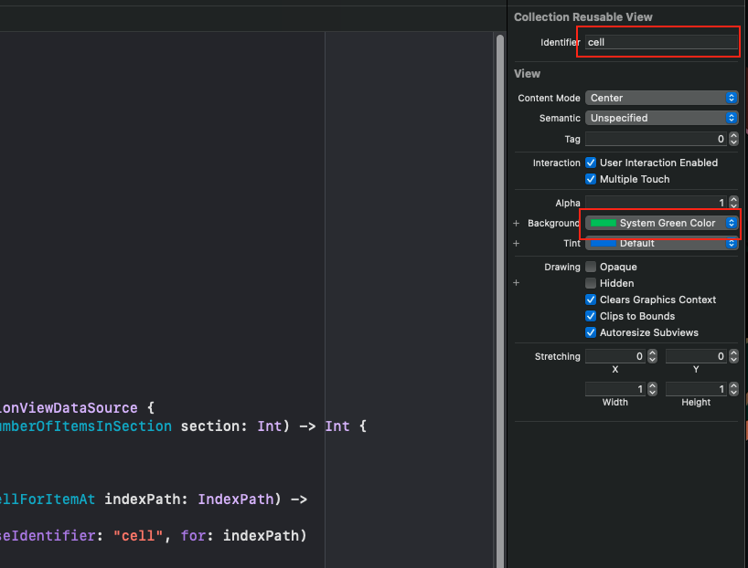 ▼ 옵션 값은 다음과 같이 설정해줍니다. Identifier의 경우 셀을 재사용할 때 필요한 식별자입니다. 백그라운드는 아무 색상으로 바꿔도 되지만 저는 녹색으로 변경했습니다.