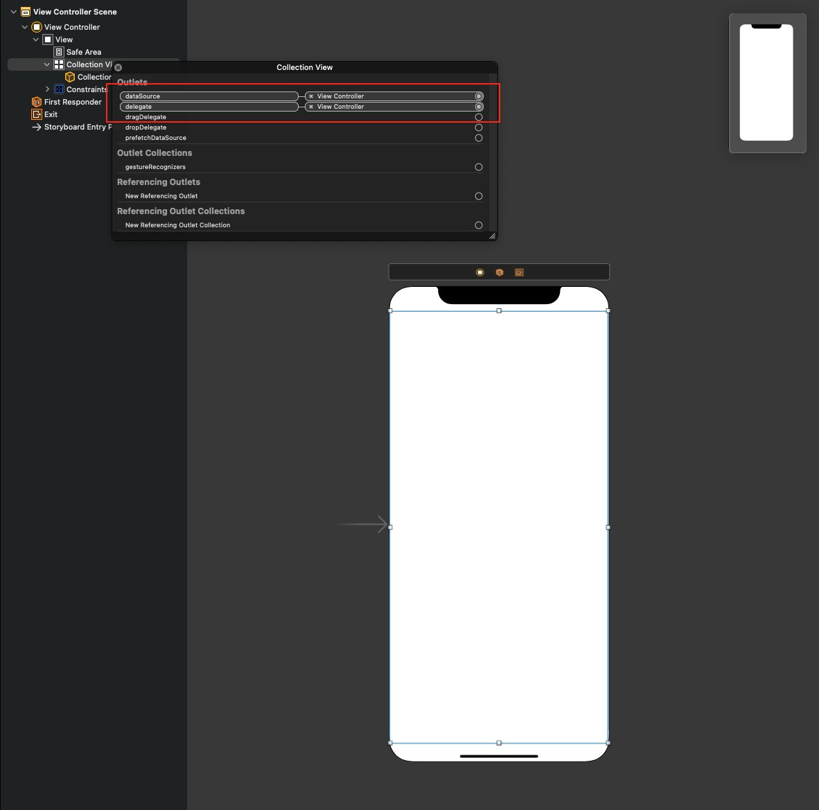 ▼ 스토리보드에 UICollectionView를 드래그해서 올리고 오토레이아웃을 좌우상하단에 걸어줍니다. 그리고 delegate, dataSource를 뷰 컨트롤러에 연결해주면 됩니다.