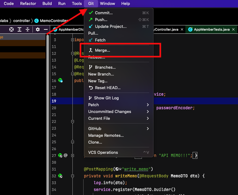 ▼ 메뉴바에서 Git 메뉴를 선택하고 하위 메뉴중에 Merge...를 선택합니다.