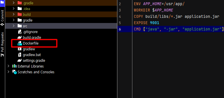 ▼ 최상위 경로에 다음과 같이 docker 파일을 만들어줍니다. EXPOSE에 원하는 포트를 입력합니다.