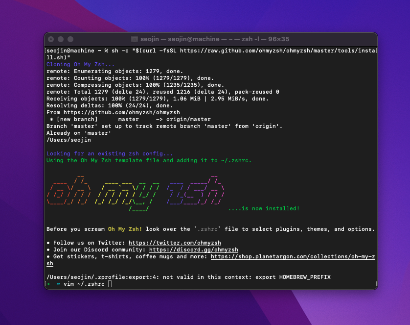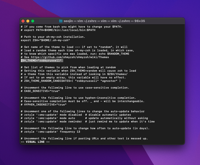 ▼ 다음 명령어를 통해서 zsh 설정파일을 열어줍니다.