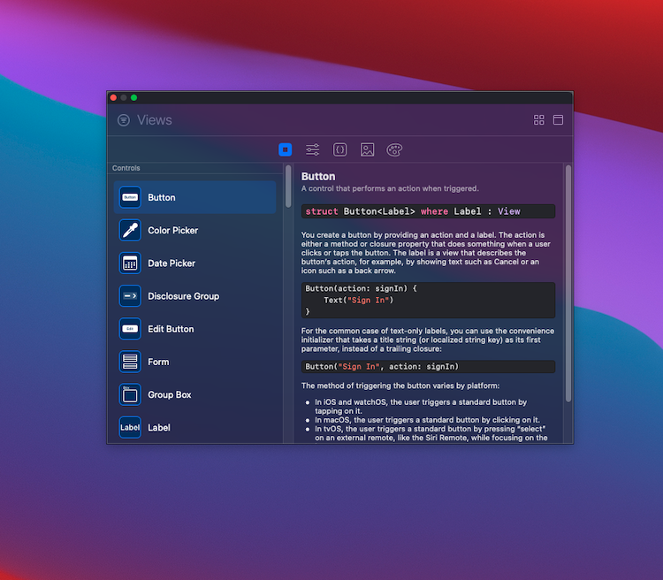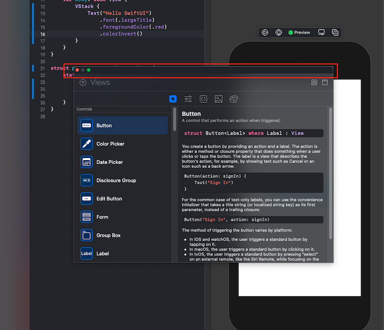 ▼ Xcode와 완전히 창이 분리되서 독립적인 것을 확인할 수 있습니다. 라이브러리 창 같은 경우 디자인 리소스, 이미지뿐만 아니라 스위프트 UI에 필요한 Modifier, 이미지 리소스, 색상과 같은 것을 한눈에 볼 수 있어서 편리합니다. 그리고 만약 + 버튼을 눌러서 독립적인 창을 띄우려면 + 버튼을 마우스로 누르기 전에 키보드의 Option키와 함께 누르면 다음과 같은 동일한 효과가 나타납니다.