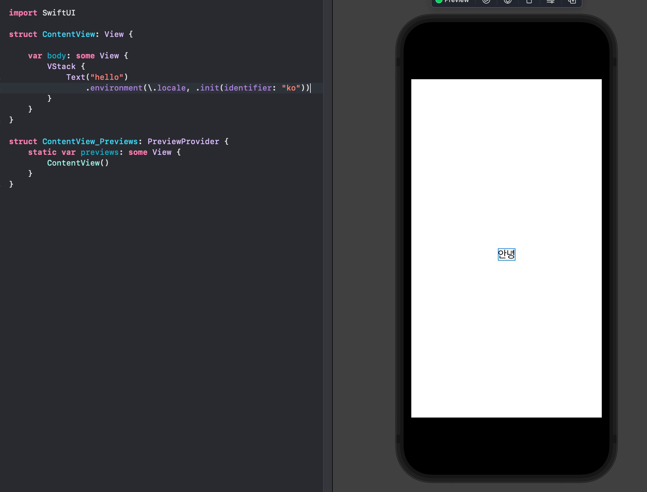 스위프트UI에서 다국어 처리를 해보도록 하겠습니다. 기존 오브젝티브 C나 Swift에서 하던 방식보다 훨씬 간단하게 처리할 수 있는 장점이 있습니다. 다음과 같이 .enviroment 옵션을 줘서 강제로 locale을 한국(ko)로 지정할 수도 있습니다. 기존 스토리 보드 개발 방식에 비해서 테스트 할 때 굉장히 유리합니다. 기존에는 자간이나 텍스트 사이즈를 및 개행을 확인해보기 위해서 일일히 실행해봐야 했는데 정말 획기적입니다.