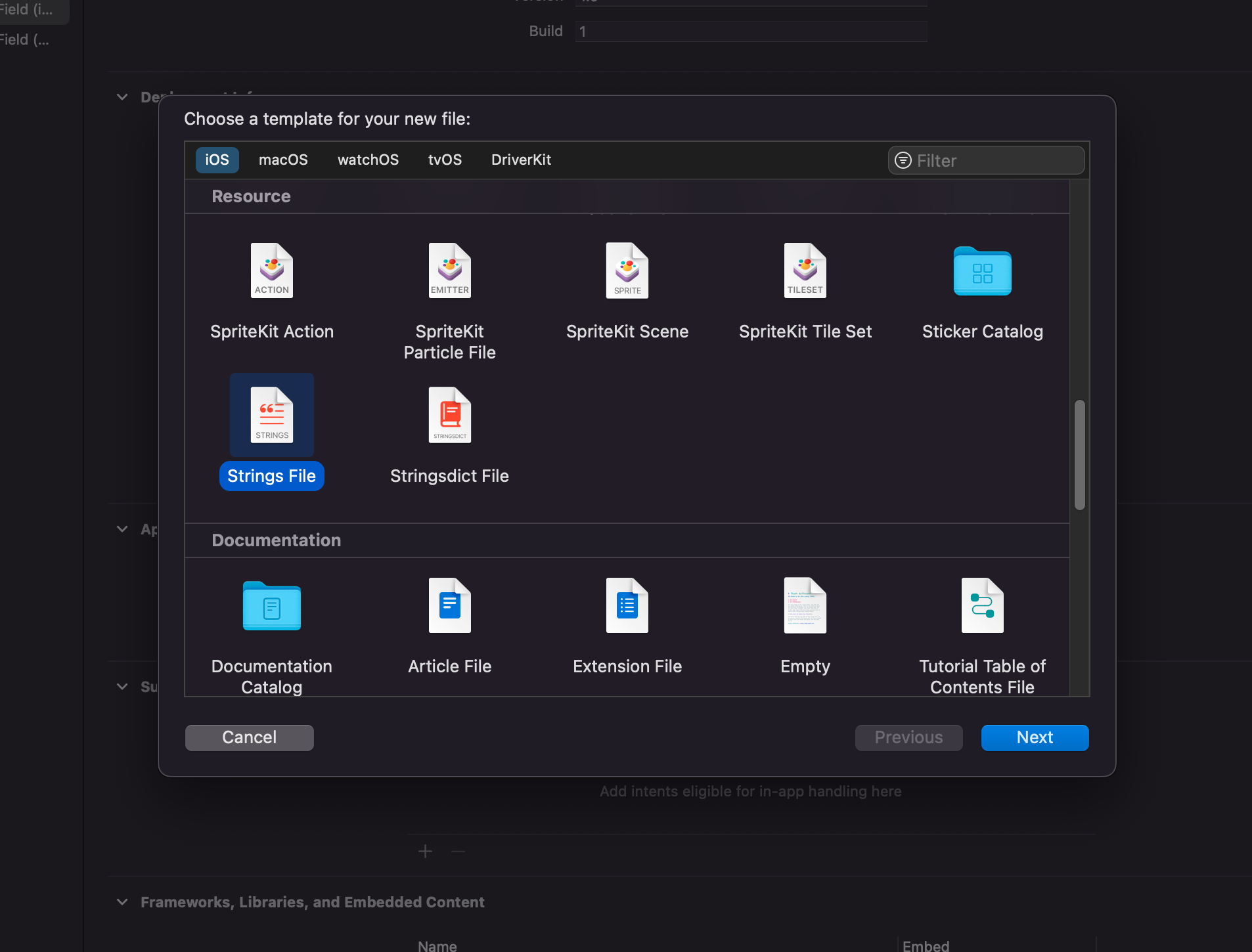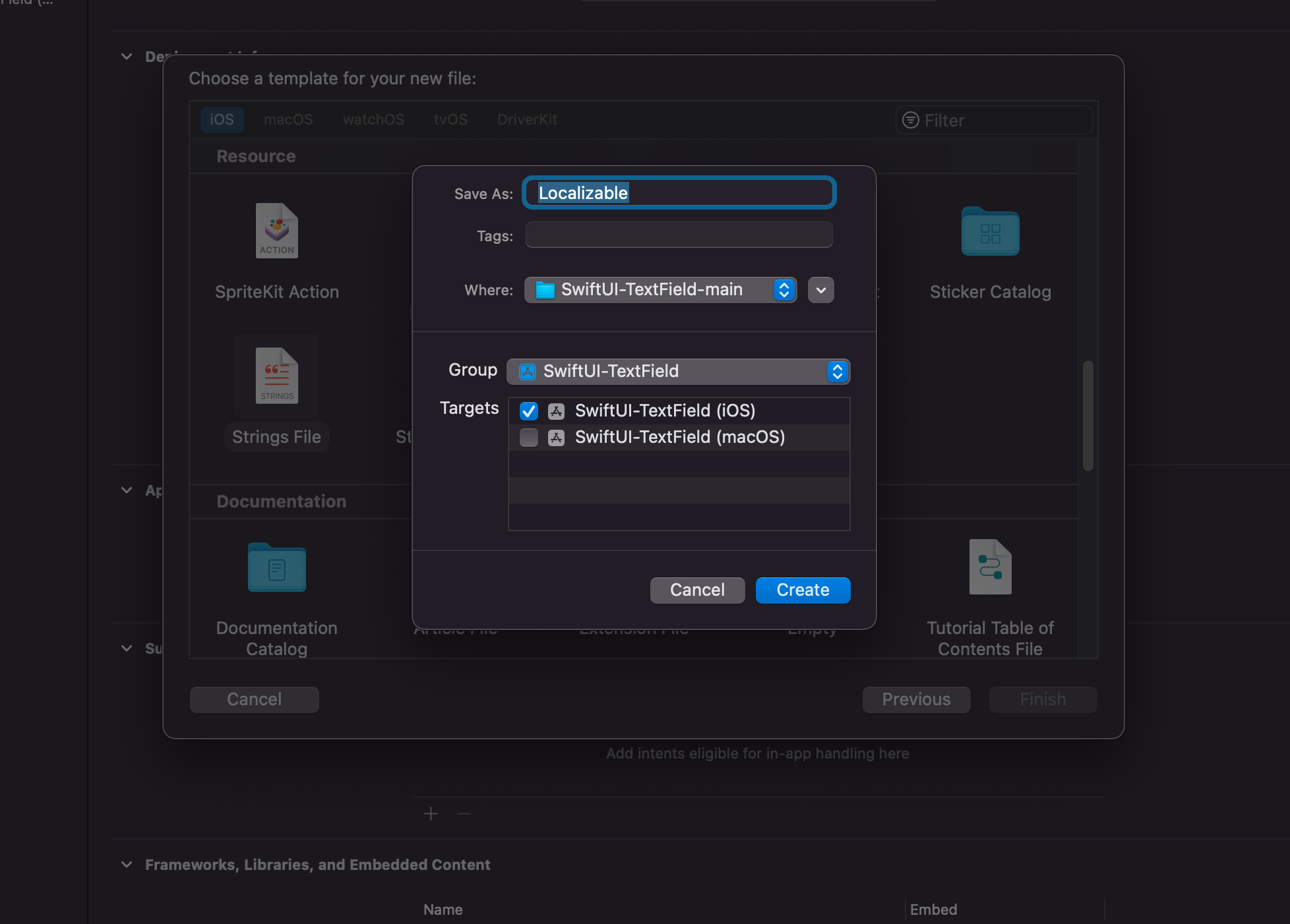 ▼ Localizable 로 기본 설정된 것을 확인할 수 있습니다. 그대로 Create 버튼을 눌러서 생성합니다.