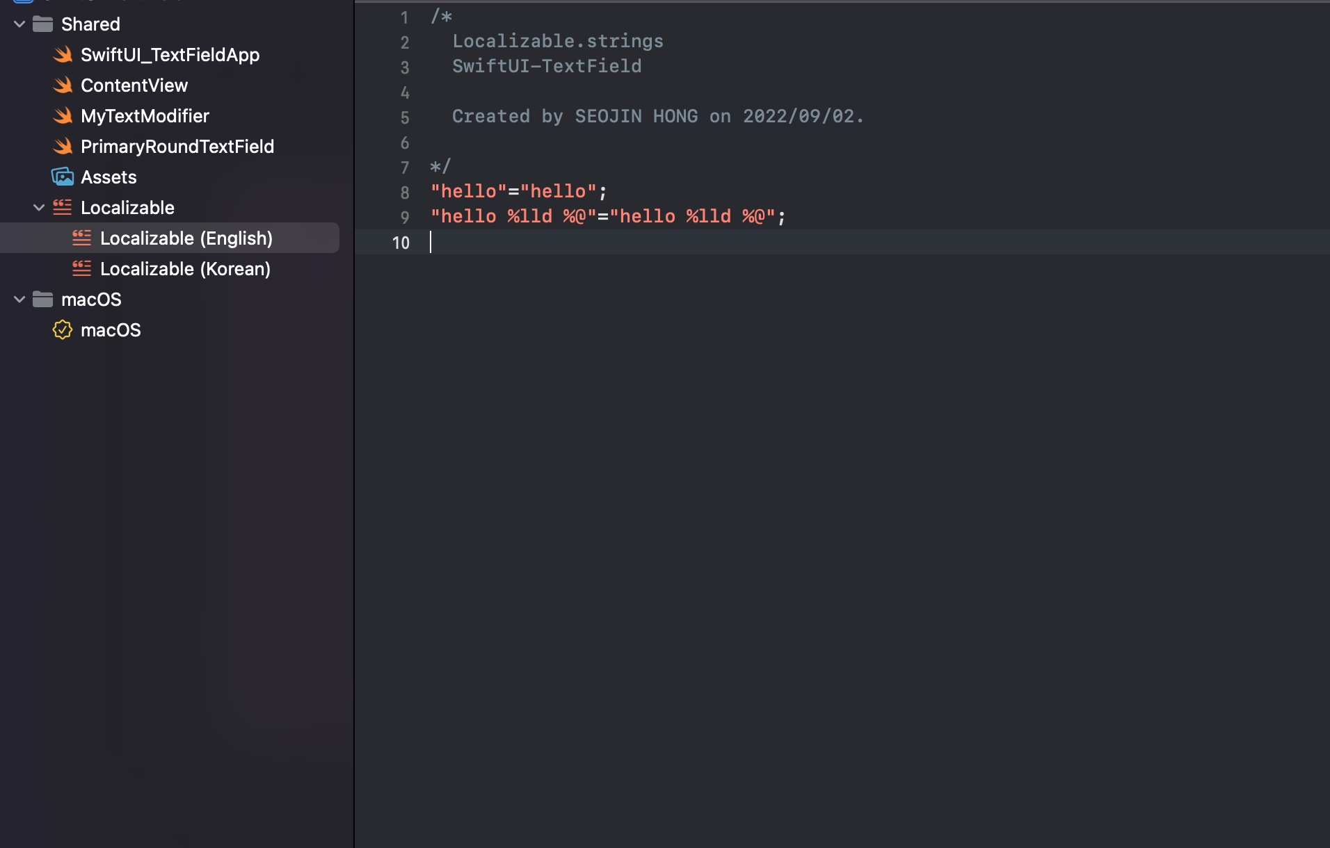 ▼ 마지막으로 Localizable 파일이 두개로 늘어난 것을 볼 수 있습니다. 해당 파일 별로 다음과 같이 문자열을 입력해줍니다. 첫번째 라인의 hello은 단순 텍스트이고 두번째 라인의 hello %lld %@는 동적으로 문자열을 수정할 수 있는 부분입니다.