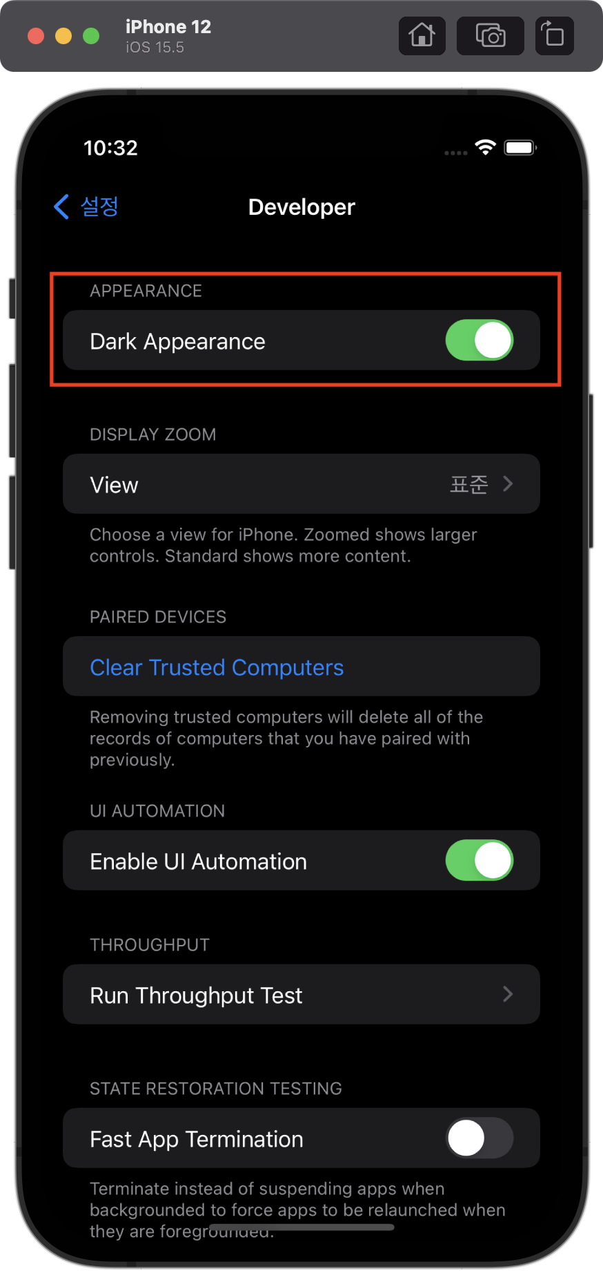 [iOS] 아이폰 시뮬레이터 다크모드 설정 (Dark Appearance)