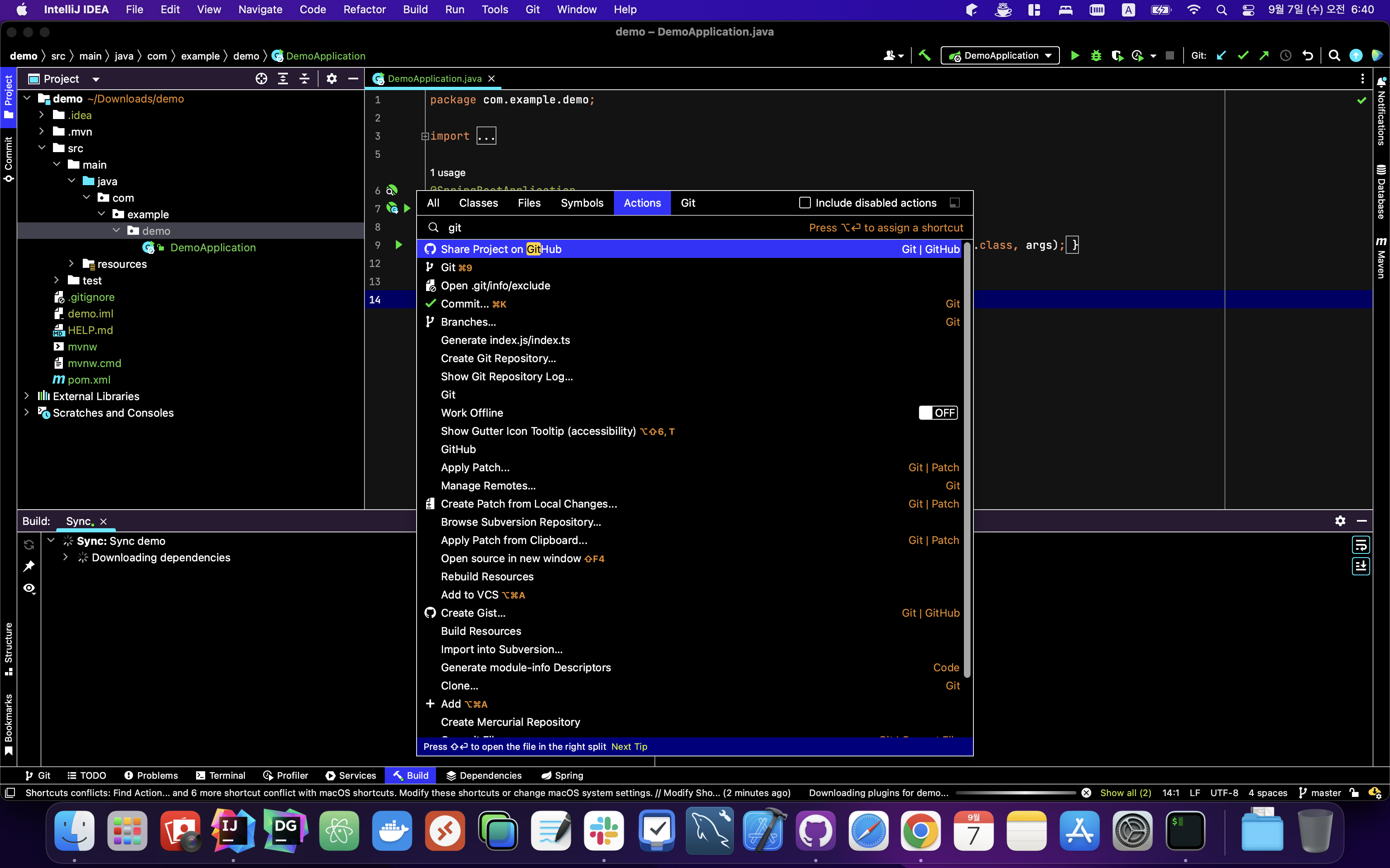 ▼ 이제 검색창에 git이라고 검색하면 최 상단에 Share Project on Github라는 메뉴를 볼 수 있습니다. 엔터 또는 마우스 클릭으로 해당 메뉴를 선택합니다.