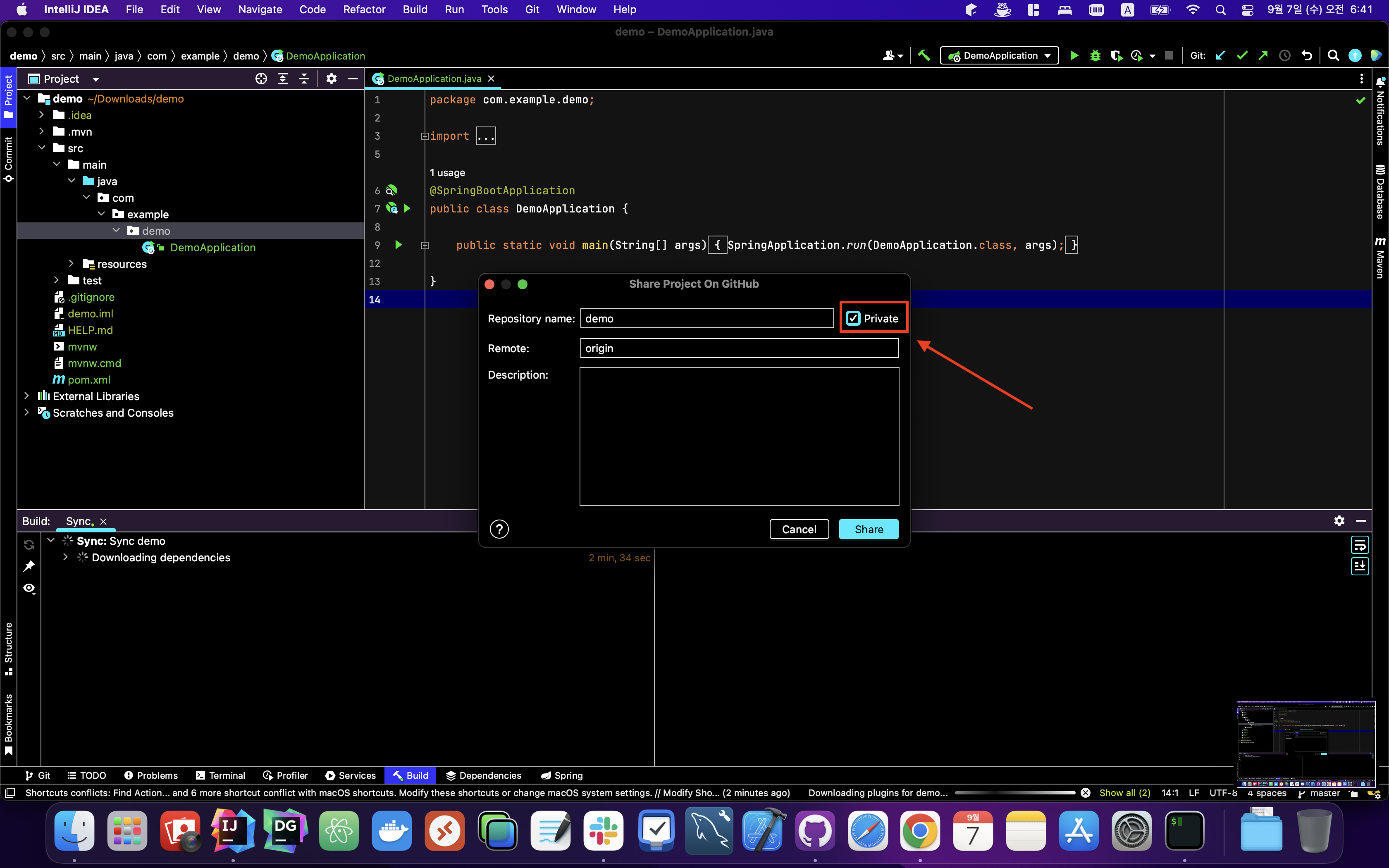 ▼ 이제 프로젝트 이름이랑 리모트 이름을 설정하고 Share를 눌러줍니다. 만약 비공개 프로젝트로 하고 싶다면 Private 체크박스 버튼을 눌러주는 것을 잊지 않습니다.