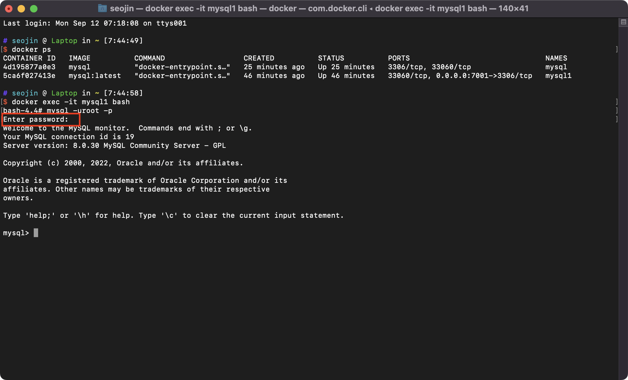 ▼ 컨테이너에 접속한 뒤 생성시 입력했던 MySQL 패스워드를 입력해 로그인을 합니다. (1234)
