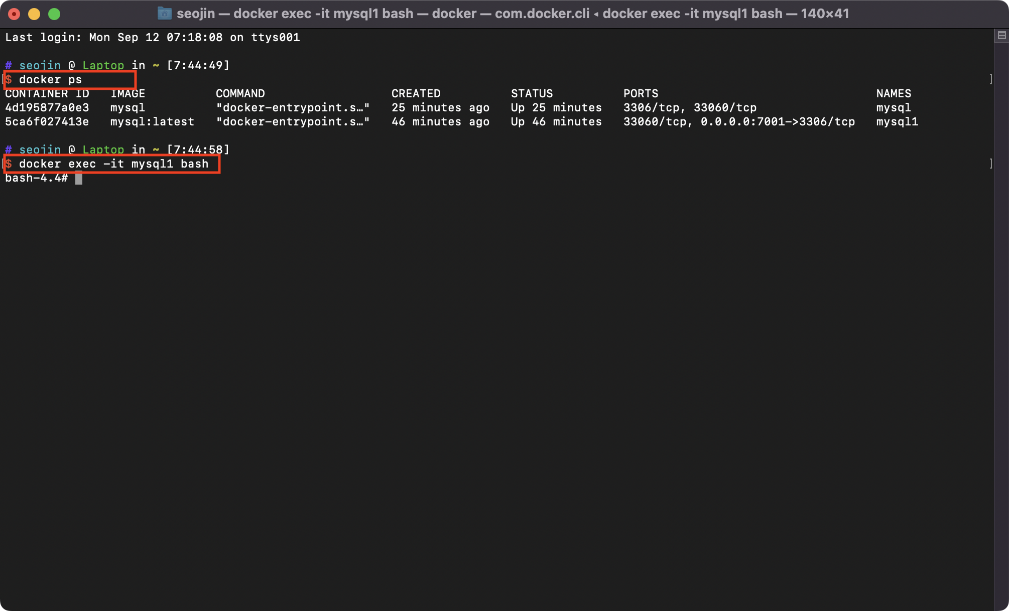 ▼ 이제 도커의 ps 명령을 통해 mysql 컨테이너가 잘 만들어졌는지 확인해봅니다. 그리고 exec 명령으로 만들어진 도커 컨테이너에 접속합니다.