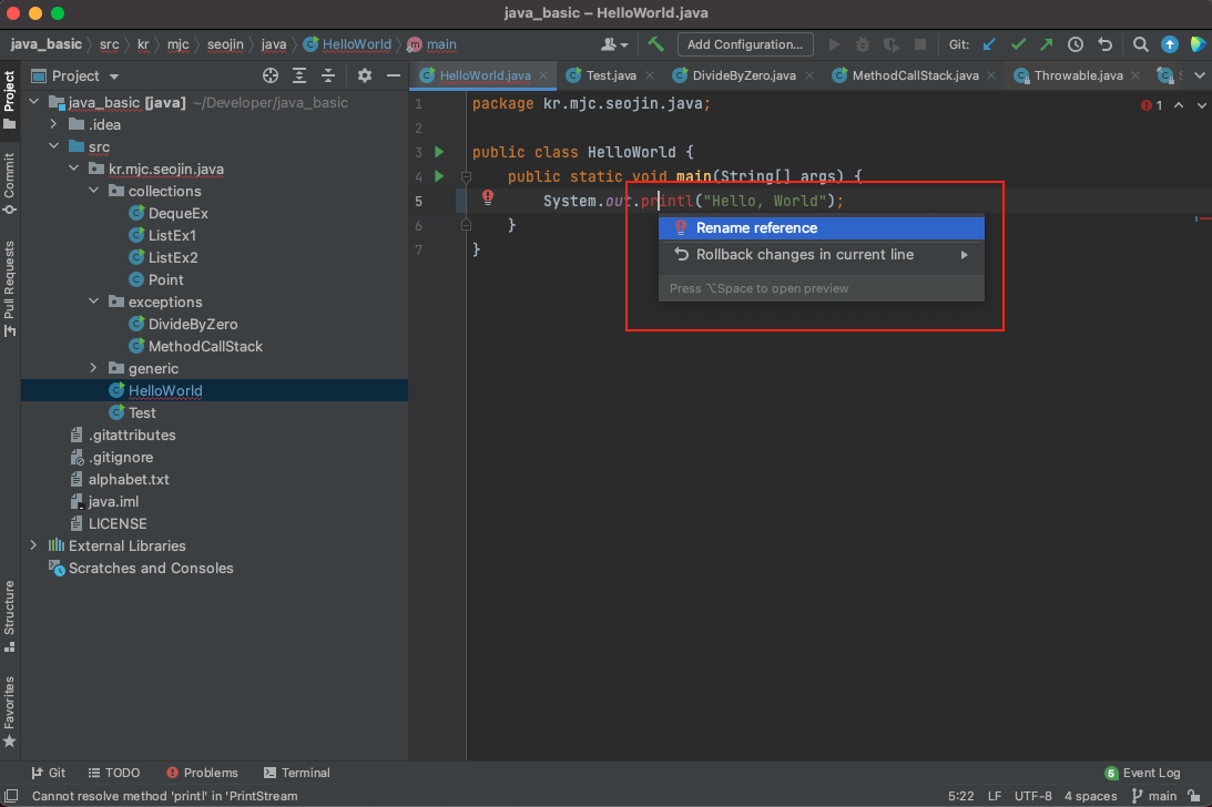 - Go to File (⇧ + ⌘ + O) : 파일을 찾을 때 사용합니다.