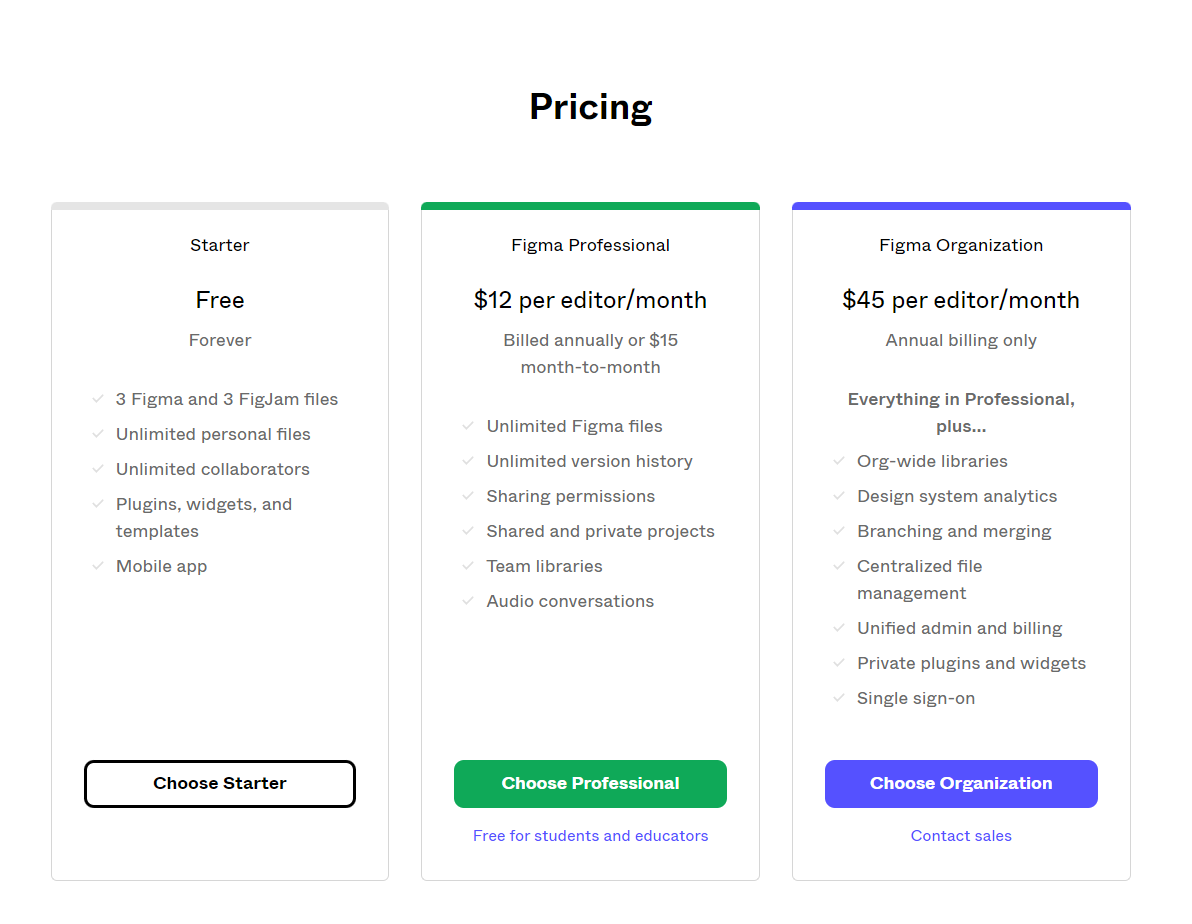 다른 일반적인 서비스와 달리 피그마는 팀 기준으로 팀에 편집자 수에 따라서 결제 종류가 달라집니다. 즉 에디터 권한을 몇 명을 가져갈 것이냐에 따라 다릅니다. 에디터가 2명이면 무료(Starter)이고 프로젝트는 3개를 만들 수 있습니다. 개인 사용자의 경우 에디터가 추가될 때마다 12달러식 증가합니다. 만약 기업용으로 사용하려면 에디터 한 명당 45달러식 증가합니다. 요금 체계가 복잡할 수도 있으나 사용자에 따라서 과금한다는 점이 마음에 듭니다.