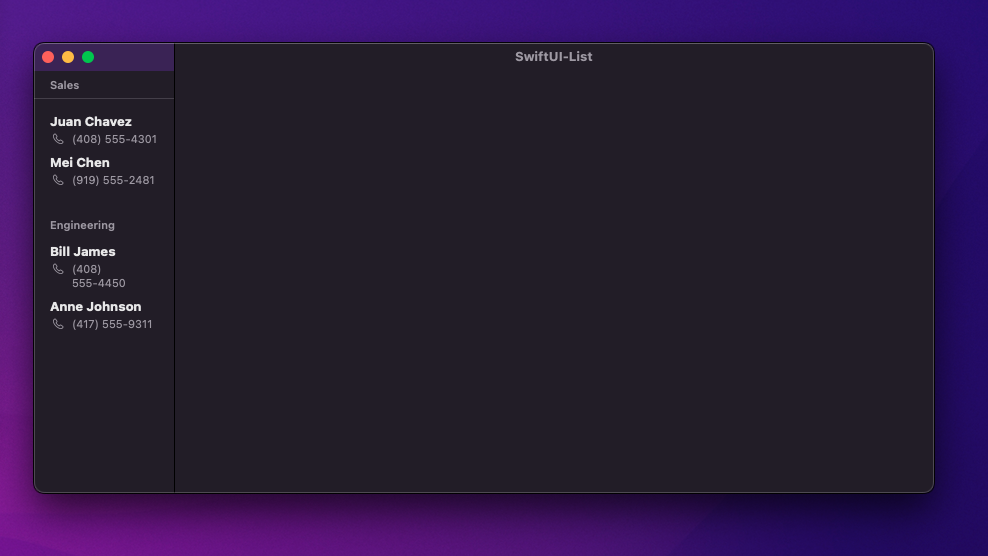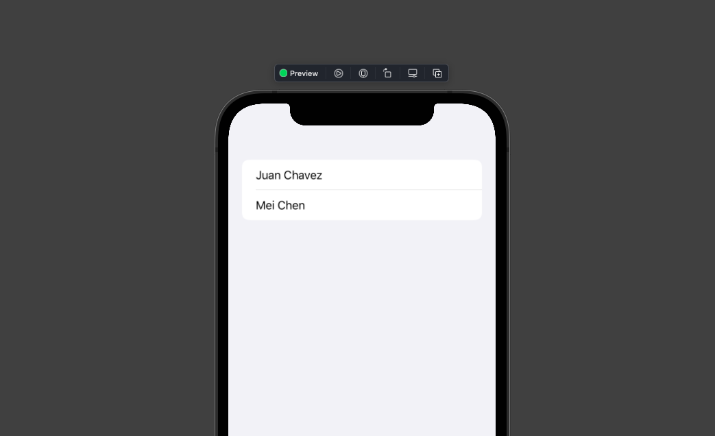 ▼ 다음과 같이 Person 데이터 구조체와 staff 라는 Person 배열을 생성합니다. 그리고 view에 ForEach 구문을 통해서 리스트를 표현해줍니다. 그럼 간단한 리스트를 확인할 수 있습니다.
