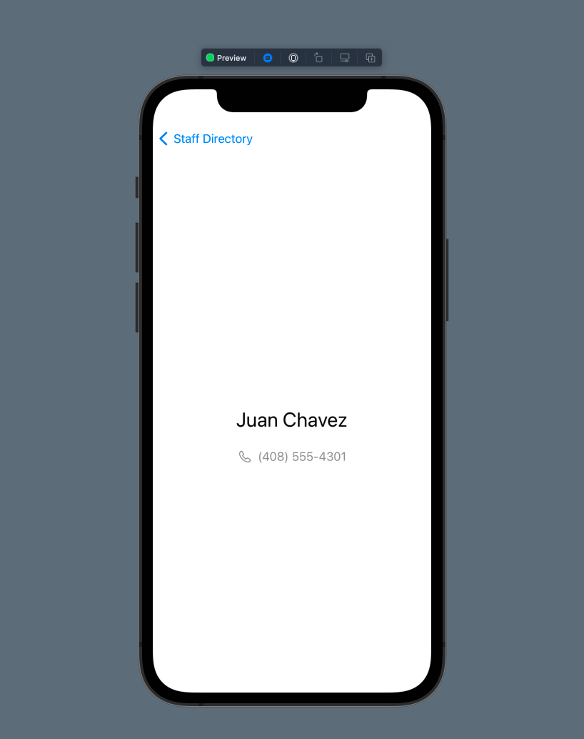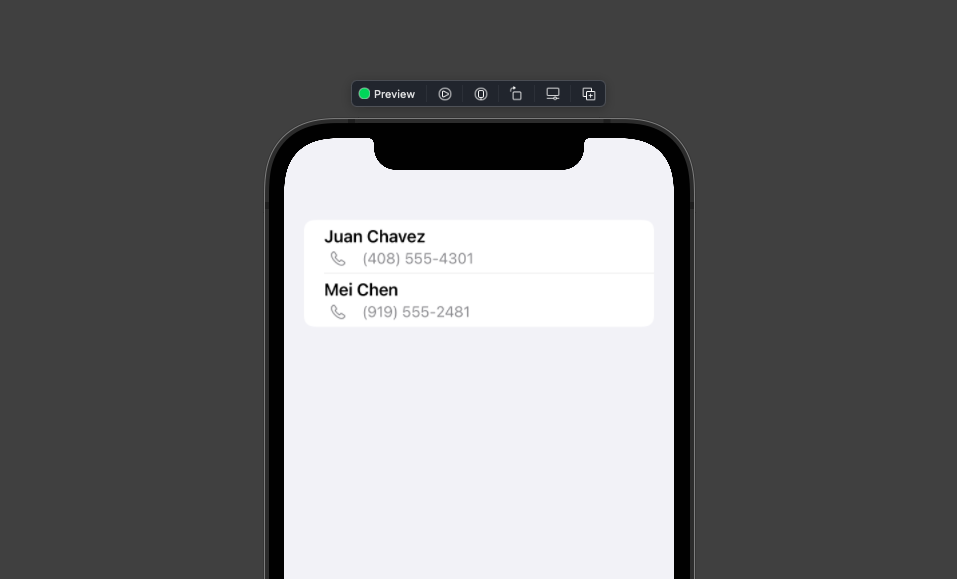 ▼ 이제 VStack와 HStack을 이용해서 이름뿐만 아니라 전화번호 그리고 전화기 모양의 아이콘을 리스트로 표현합니다. 그밖에 옵션으로 텍스트 색상과 폰트를 설정해줍니다.
