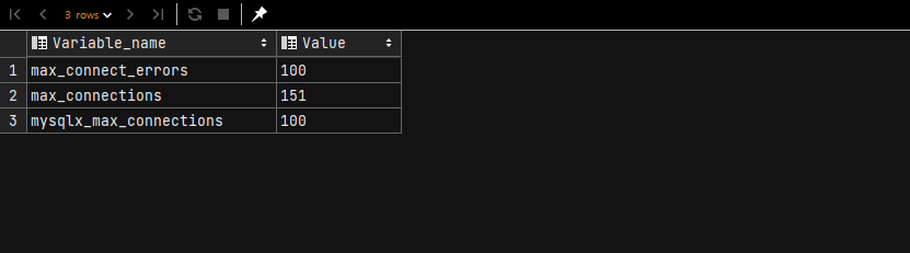 ▼ max_connecions 값을 확인합니다. 동시접속에 대한 값입니다. 기본값은 보통 151로 지정되어 있습니다.