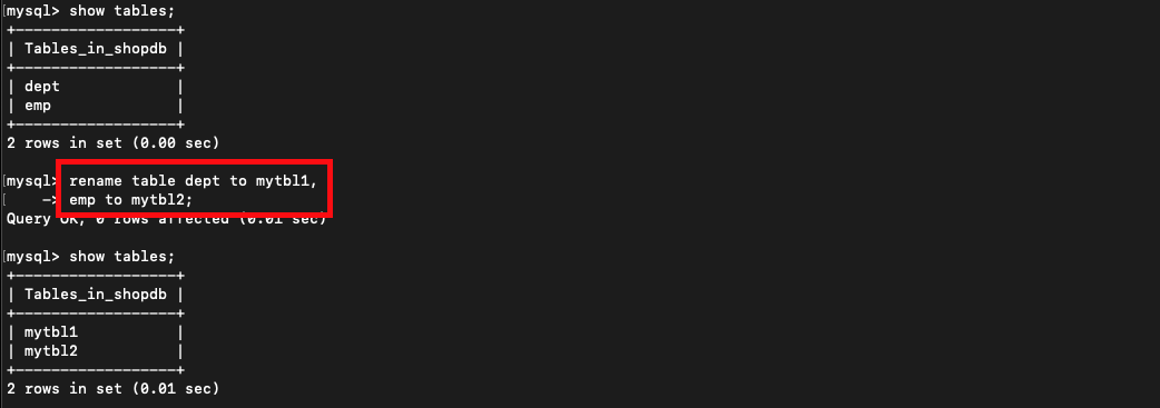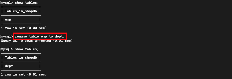 RENAME 명령으로 한 개의 테이블 이름을 변경합니다. (예: shopdb 데이터베이스의 emp 테이블을 dept 테이블로 변경해보겠습니다.)